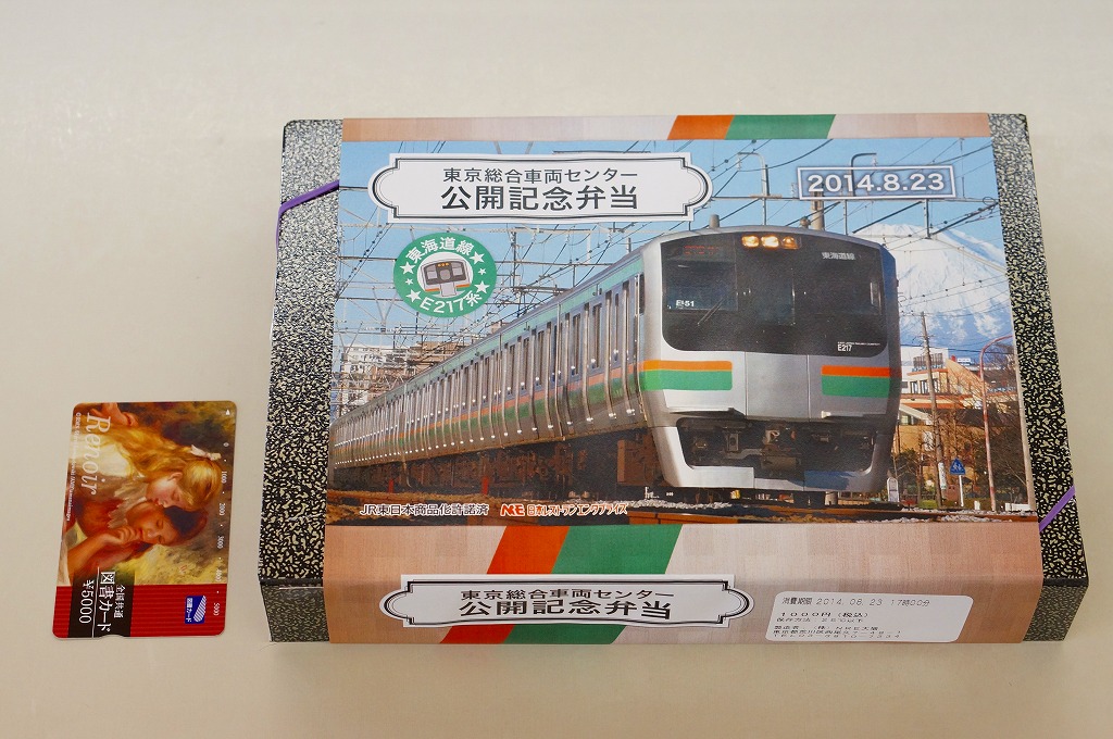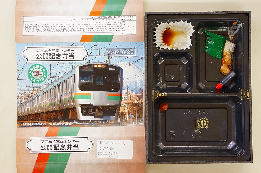2014(平成26)年8月23日の鉄道工場公開イベントで販売されたお弁当。この年の記念弁当は、NREこそ前年と同じく3種類を用意したが、大船軒のものは無かった。掛紙は東海道本線のE217系電車。中身は普段「さがみの」の名称でNREが受注生産している宅配弁当。日の丸御飯にサーモン味噌焼、豚生姜焼、玉子焼、がんもやニンジンなどの煮物、マイタケ天ぷら、大豆たんぱく甘辛煮など。