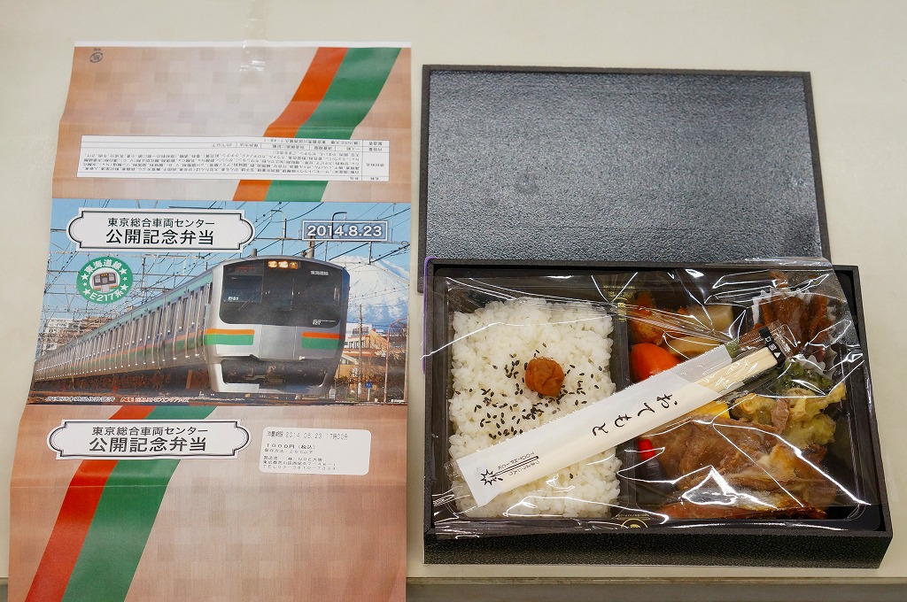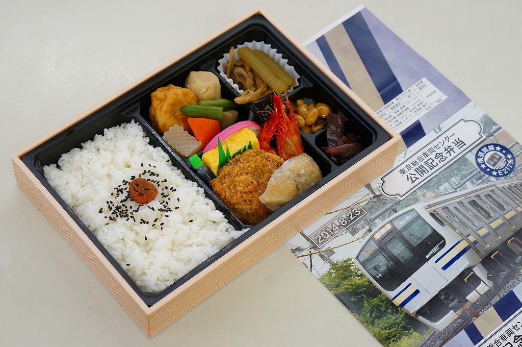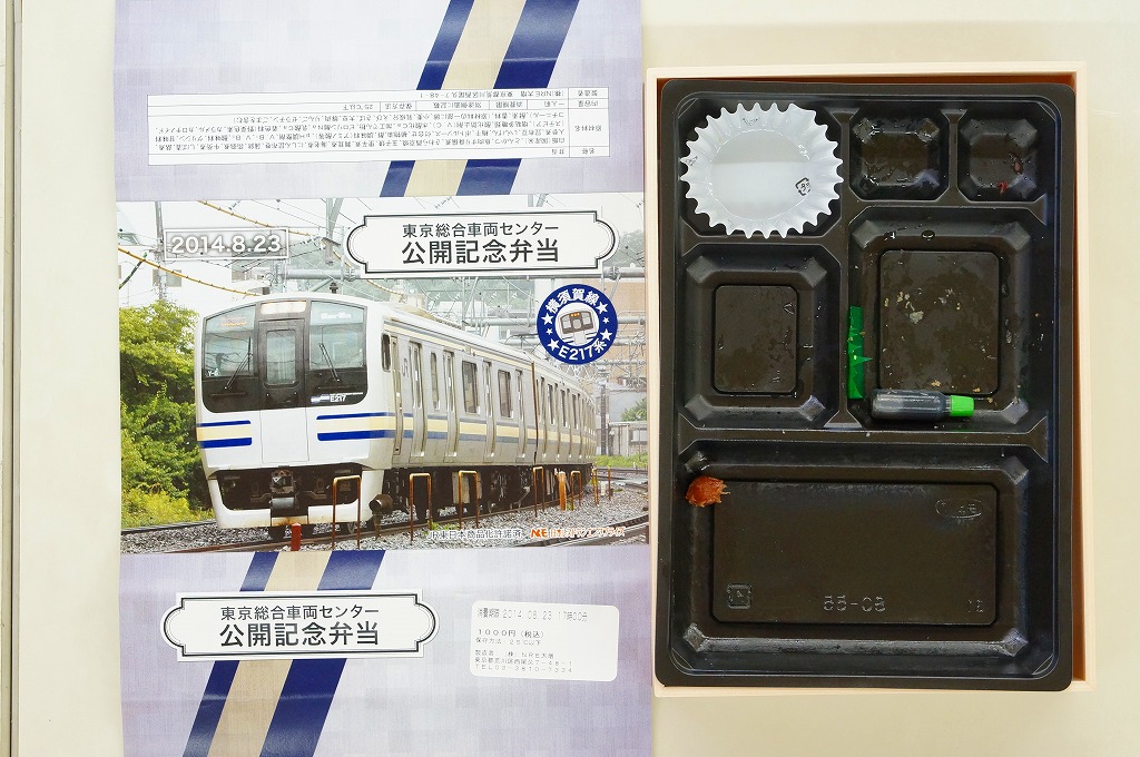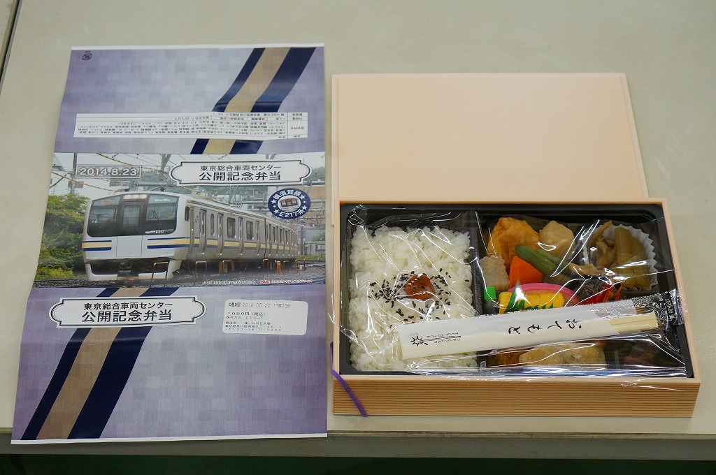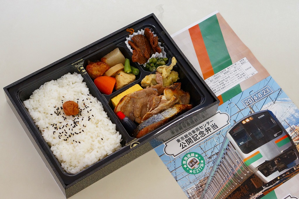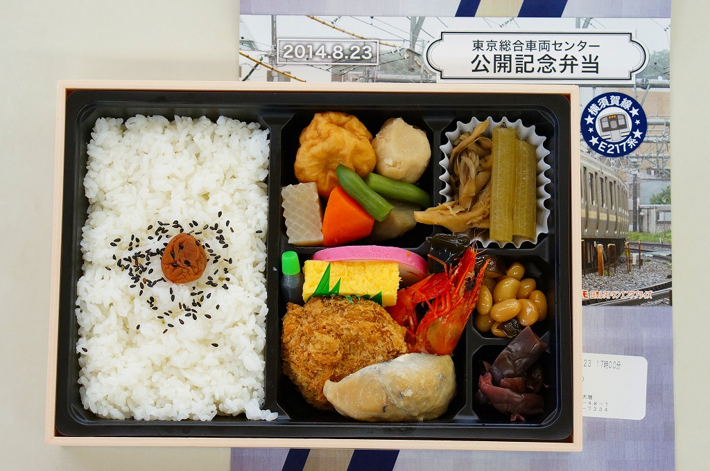 2014(平成26)年8月23日の鉄道工場公開イベントで販売されたお弁当。この年の記念弁当は、NREこそ前年と同じく3種類を用意したが、大船軒のものは無かった。掛紙は総武快速・横須賀線のE217系電車。中身は普段「ありあけ」の名称でNREが受注生産している宅配弁当。日の丸御飯にトンカツ、サワラ西京焼、有頭海老、ニシン昆布煮、玉子焼、がんもやサトイモなどの煮物、マイタケ煮など。