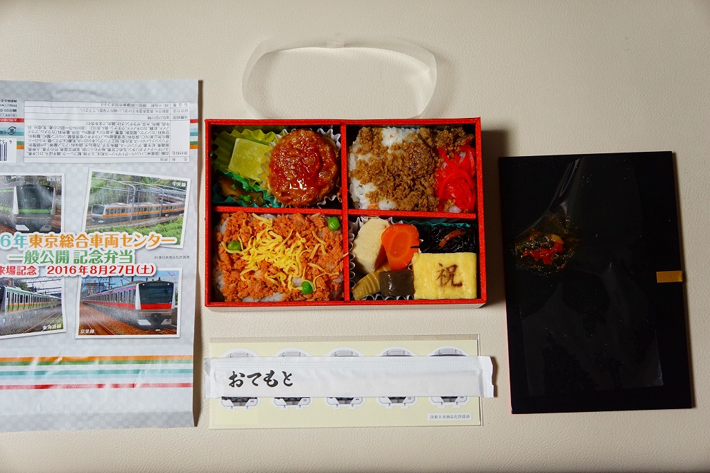 2016(平成28)年8月27日の鉄道工場公開イベントで販売されたお弁当。この年の記念弁当は大船軒の1種類しかなく、NREの東京駅弁もあまり多くなく、遠く兵庫県神戸の淡路屋の新幹線型容器の駅弁が幅を利かせていた。前年は不参加だが、1種類だけ、山手線E235系電車の掛紙を使う記念弁当が出ていた模様。掛紙の写真は、横浜線、中央線、東海道線、京葉線のE233系電車。掛紙の裏面には、E233系の運用線区らしくない、埋立地でなさそうな海沿いを走る風景の塗り絵が印刷された。