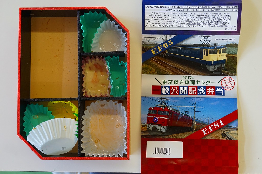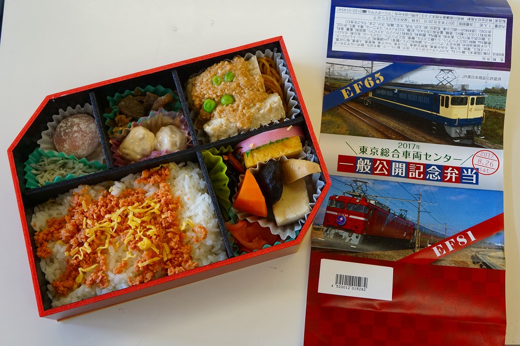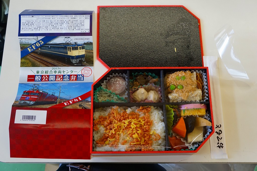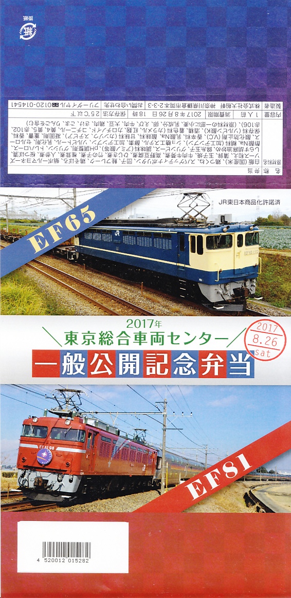 2017(平成29)年8月26日の鉄道工場公開イベントで販売されたお弁当。この年も、記念弁当はこの1種類のみ。ネット上にEF65とEF81の記念弁当が出るとあり、今年は久々に複数の公開記念弁当が出るのかと思ったら、実物では1枚の掛紙にEF65とEF81の写真を載せていた。