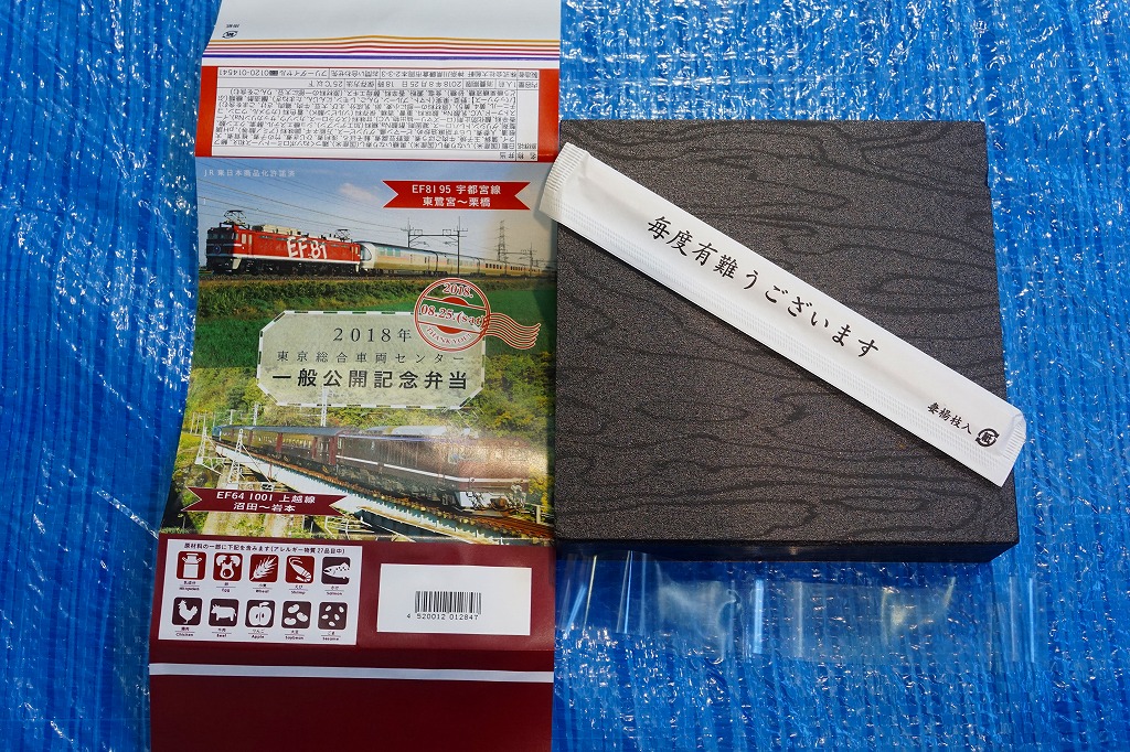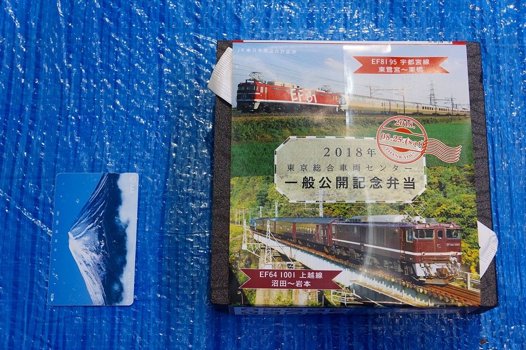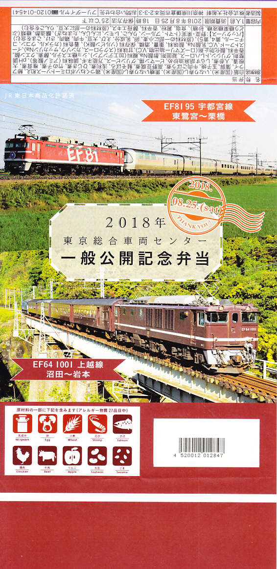 2018(平成30)年8月25日の鉄道工場公開イベントで販売されたお弁当。他に東京駅のキャラクターや新幹線型容器の駅弁も売っていた。掛紙は赤い電気機関車EF8195が牽くカシオペア向け寝台客車と、茶色い電気機関車EF641001が牽く旧型客車の走行写真。