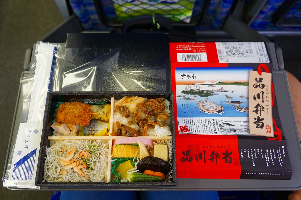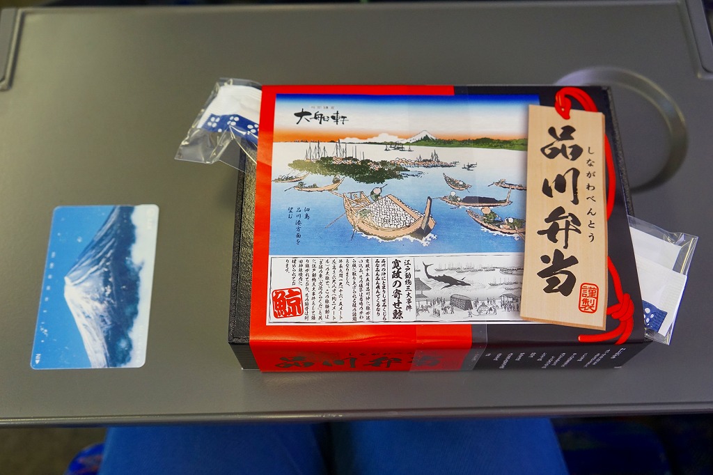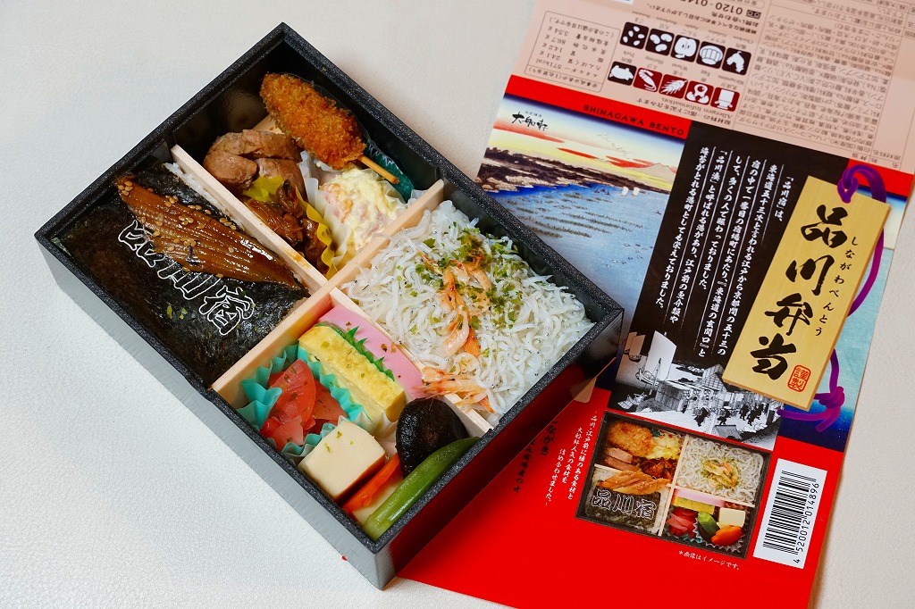 上記の駅弁「品川弁当」の、2018(平成30)年時点での姿。掛紙には「江戸動物三大事件 寛政の寄せ鯨」として、寛政10年(1798)年の東京湾でのクジラ出現騒動の頃のものに見える絵柄や説明文と、駅弁の名前やおしながきを描く。4区画の中身は、サクラエビを載せたしらす御飯、煮穴子とあさりのしぐれ煮のせ御飯、くじら串揚とちくわ天とアジ酢漬けと豚みそ漬焼、高野豆腐やシイタケなどの煮物とかまぼこと玉子焼など。