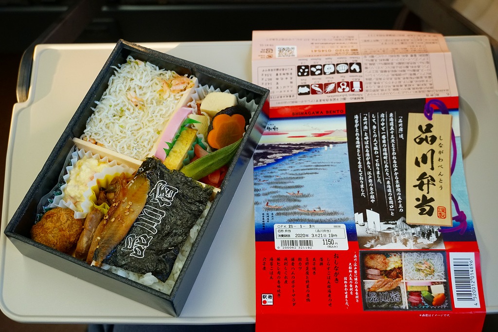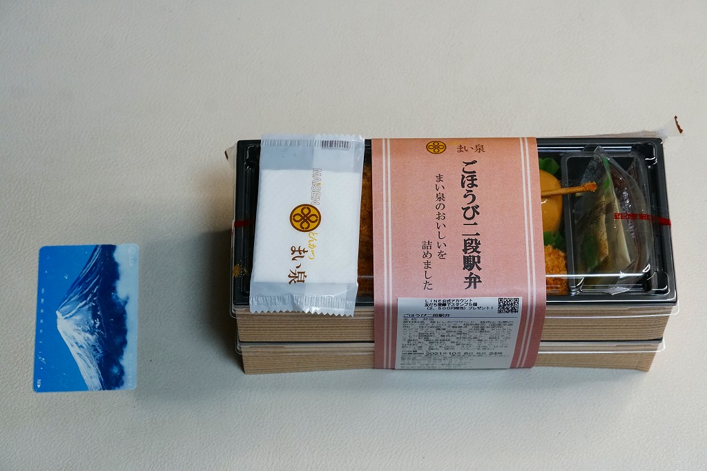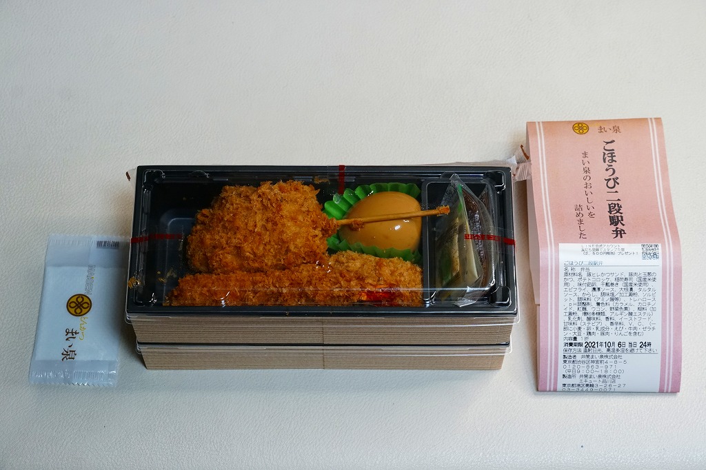 2020(令和2)年の春までに品川駅で発売か。東京のデパ地下やエキナカのどこにでもあるとんかつ店「まい泉」の弁当であり、しかしこれはどうも品川駅限定で売られるらしく、なんといっても商品名に「駅弁」を含むので、品川駅の駅弁に見えてくる。中身は小柄な長方形のプラ容器を二段に重ねて、下段にまい泉のヒレかつサンド、いなりずし、かんぴょう細巻、大根漬、上段に煮玉子、エビフライ、タマネギの串カツ。駅弁でなくまい泉の柔らかとんかつの味と、まい泉の弁当では見ない食材が含まれる。