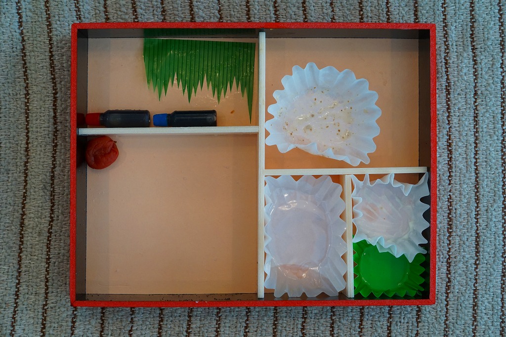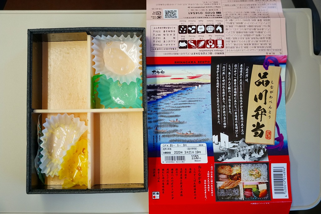4区画の中身は、「品川宿」と印刷した海苔で覆う白飯とアナゴ、サクラエビを載せたシラス御飯、野豆腐と野菜の煮物に蒲鉾と玉子焼と大根漬、鎌倉ハムのポテトサラダとくじらカツとアサリしぐれ煮と豚ヒレ焼。品川・江戸前に縁のある食材と大船軒人気の食材を詰め合わせたとする、風変わりな幕の内タイプの駅弁。
