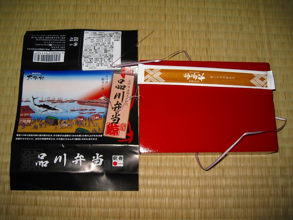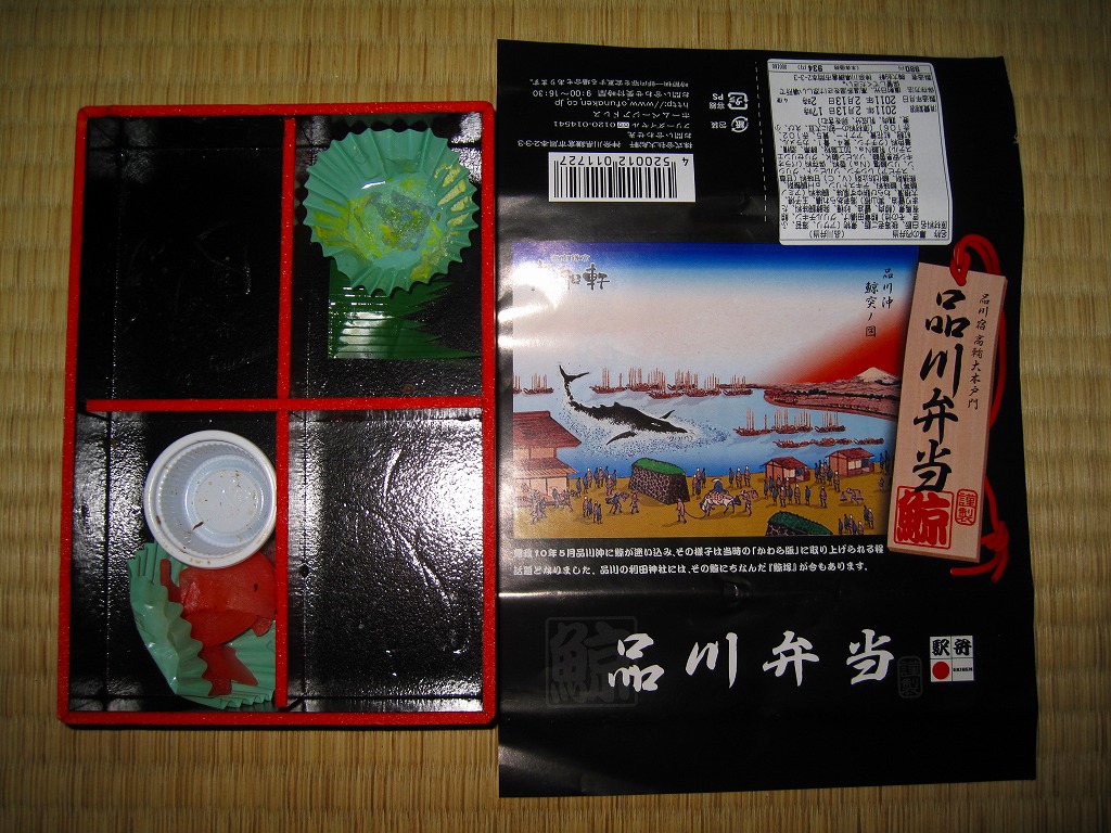 上記の駅弁「品川弁当」の、2011(平成23)年の姿で、発売当時の姿。値段以外の変化はないと思っていたら、中身に加えて掛紙の絵柄も変わっていた。当時の掛紙には「品川沖鯨突ノ図」とある絵画を印刷。中身はサクラエビの御飯、海苔佃煮とアサリを載せた御飯、グリルチキンと海老あられ揚とクジラの有馬煮、クジラの竜田揚と有馬煮にかまぼこや玉子焼やわらびもちなど。今の品川駅からは想像も出来ないが、東京湾に面して江戸前の海の幸が味わえたはるか昔の品川が、とてもよくイメージされていると思った。