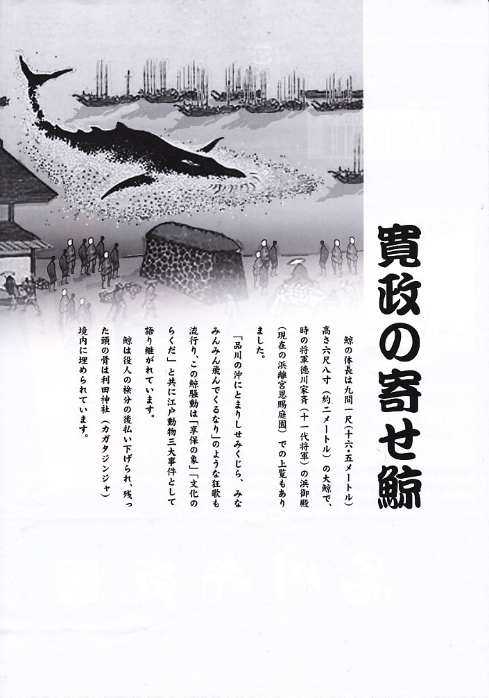 この出来事は「寛政の寄せ鯨」として、享保13年6月13日(1728年7月19日)にベトナムから中国を経て長崎へ上陸した牡牝2頭の子象のうち牡象が翌年に74日かけて5月25日(1729年6月21日)に江戸まで歩いてやってきた「享保の渡来象」、文政4年(1821年)6月または7月にオランダ船から長崎出島へ上陸した牡牝2頭のヒトコブラクダが見世物になり3年後の8月に江戸にやってきた「文政の駱駝」とともに、江戸の三大奇獣とされている。東京都品川区東品川の利田神社には当時の鯨塚が残る。駅弁の発売当初から通していたそんな筋は不思議と、2019(令和元)年7月のリニューアルで失われてしまった。