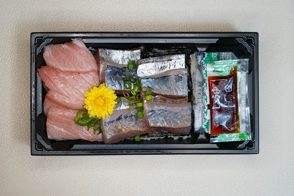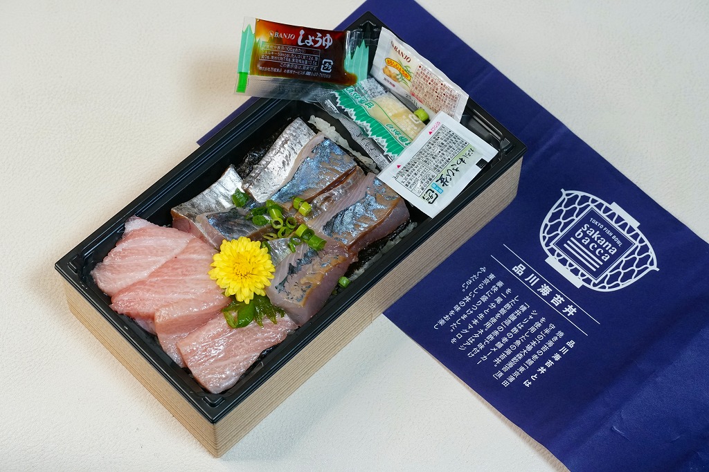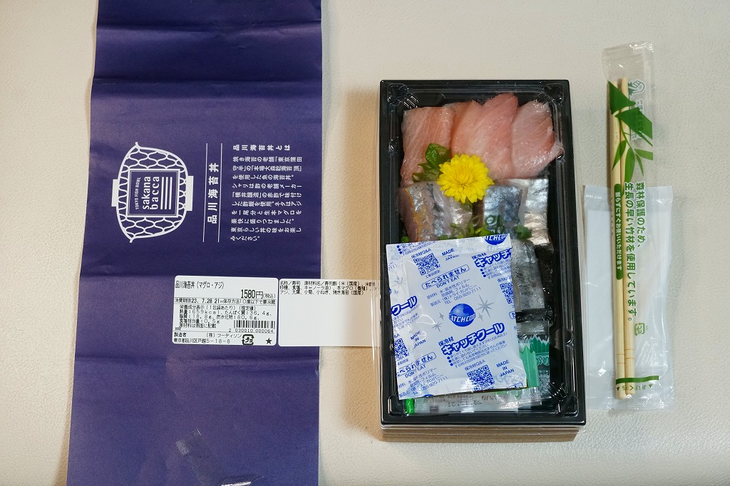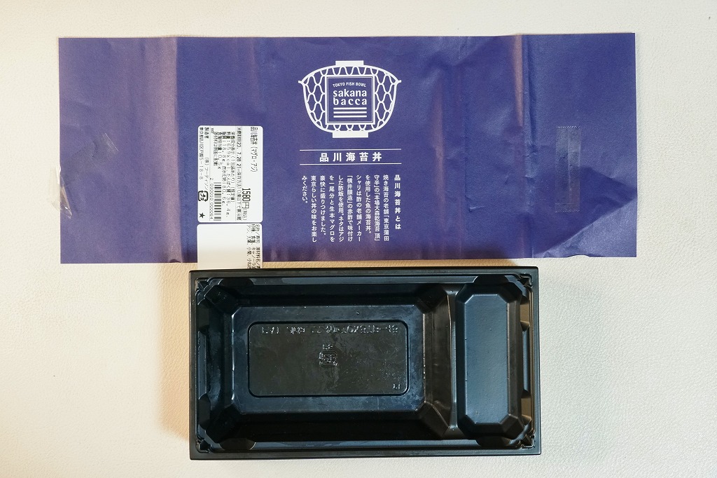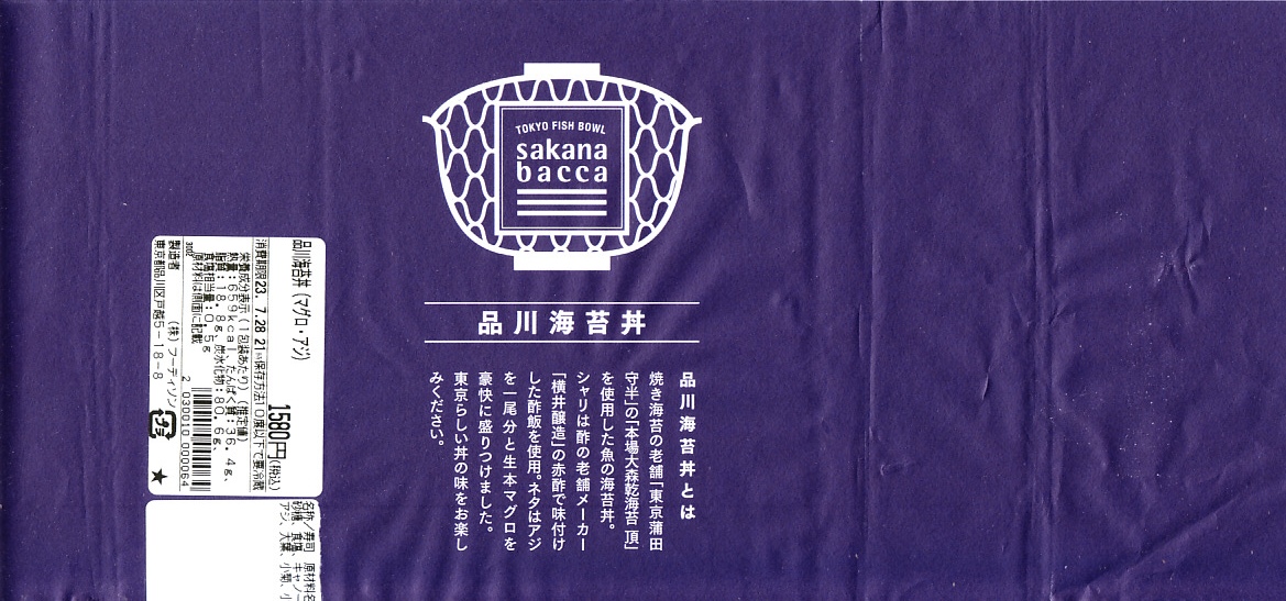 品川駅構内の商業施設「エキュート品川」には2019(平成31)年3月22日に出店した鮮魚店テナント「サカナバッカ」で、品川駅限定のお弁当として発売。駅弁でもよく使われる長方形のプラ容器に、お店のロゴマークと品川海苔丼の説明文を記した青い掛紙を巻く。中身はその記述を借りると、酢の老舗メーカー「横井醸造」の赤酢で味付けした酢飯を、焼き海苔の老舗「東京蒲田守半」の「本場大森乾海苔 頂」で覆い、アジを一尾分と生本マグロを豪快に盛り付けたもの。これにしょうゆ、おろししょうが、おろしわさび、甘酢がりで4袋も添付。上げぶた上げ底でなく、ブロック状の刺身をいただく、駅弁や催事にないタイプの海鮮丼。他に「季節のばらちらし」と「べっこう丼」を発売したという。価格は2019年の発売時で1,480円、2023年の購入時で1,580円。