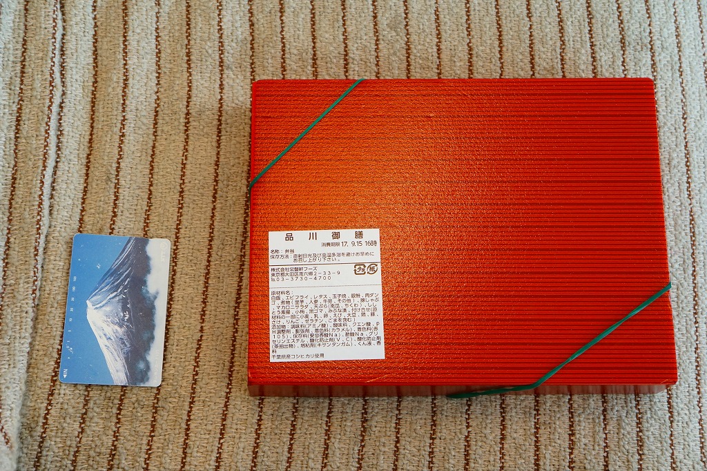 2019年9月21日に購入した、品川駅弁の掛紙。上記のものと半年しか違わないので、まったく同一かと思ったらそうではなく、アレルギー表記に関する記載が少し異なる。値段や中身は同じ。