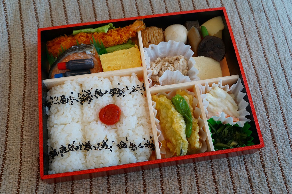常盤軒フーズの仕出し弁当の、「復刻駅弁シリーズ」のひとつ。中身は日の丸御飯に焼鮭と玉子焼、エビフライ、カボチャとちくわの天ぷら、ししとう、肉団子、サトイモやニンジンなどの煮物、豚しゃぶ、マカロニサラダ、漬物など。これが「大正12年創業」の「ロングランの幕の内」「一世を風靡した駅弁の味」といい、たしかにかつて品川駅で売られた駅弁「品川御膳」とよく似ている。