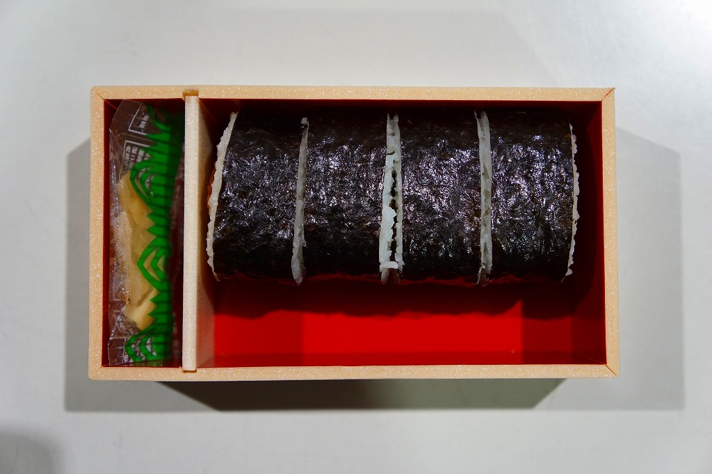これは駅弁ではなく、駅構内の商業施設のテナントの弁当あるいは惣菜。品川駅の駅弁屋が、夕刻にして全品完売で開店休業の体たらく、そこで隣接するエキナカに走った。東京や近郊の各地に店舗網を広げる、まい泉の商品であるから、品川駅や東京駅やその他各地で買える商品だと思われる。中身は小さなシールの写真のとおり、ひれかつを海苔で巻き、酢飯を巻いてさらに海苔で巻いた太巻きが1本。このチェーン店の商品どおり、カツは飯と同じくらいの柔らかさ。駅で買えば、駅弁に見えなくもない商品。