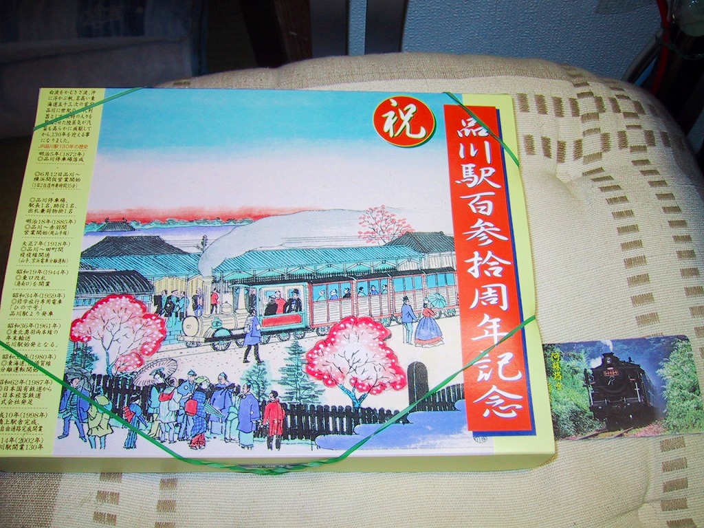 品川駅の開業130周年を記念して、2002(平成14)年に発売。記念駅弁なので御飯は赤飯を使用、駅弁では他に見たことがない巨大な蒲鉾が紅白で入る。あとはトンカツと煮物が少々など。これを白いトレーに入れてボール紙製の箱に入れており、そのふたには昔の錦絵と品川駅の略史を描いている。