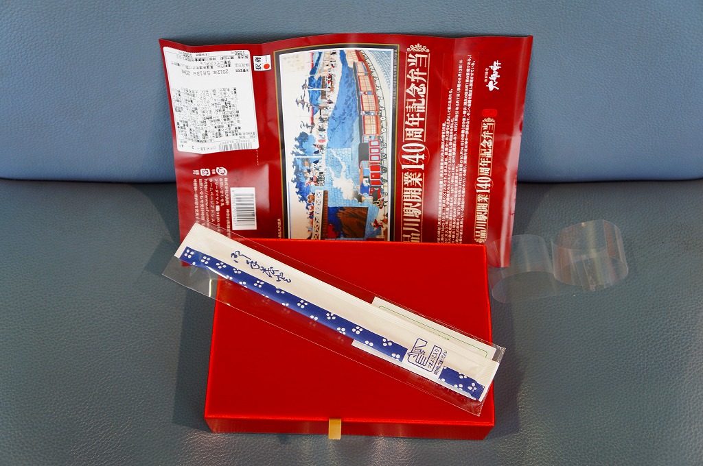 掛紙には記念ロゴマークと鳥瞰図風のイラストを描く。中身は海苔と煮アナゴと金箔を載せた茶飯、しらす御飯、アジフライ、あさり煮、ひじき煮、紅白のかまぼこと玉子焼、牛バラ肉と玉ねぎ炒め、煮物、漬物、ミニ大福。江戸前の海の物を意識した中身に見える。