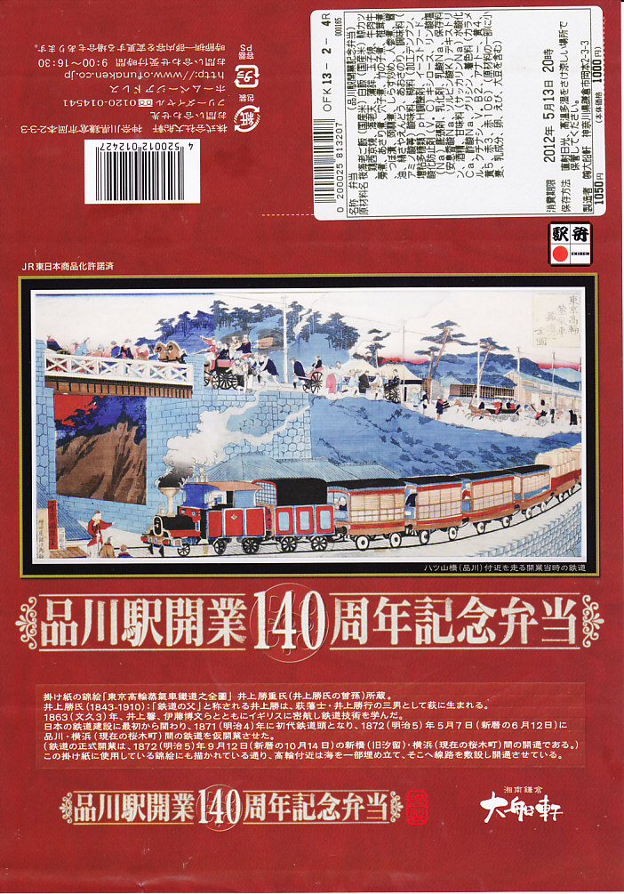 駅弁の名前のとおり、品川駅開業140周年を記念して、2012(平成24)年5月7日から6月17日まで品川駅で販売された記念駅弁。このキャンペーンでは他に、「品川駅開業140周年記念品川ステーションビール」(500円)の販売や、団体専用列車「品川駅開業140周年記念号」の運転も実施された。朱色の長方形の容器に、昔の品川駅付近を描いた錦絵を印刷した掛紙で巻く。