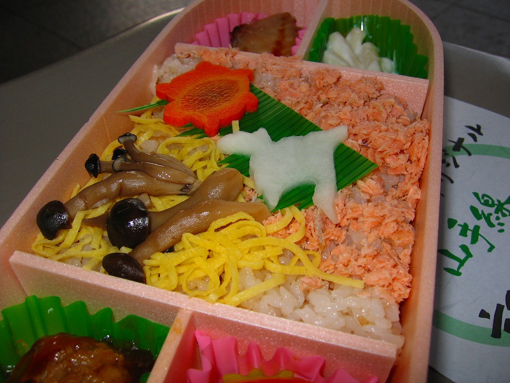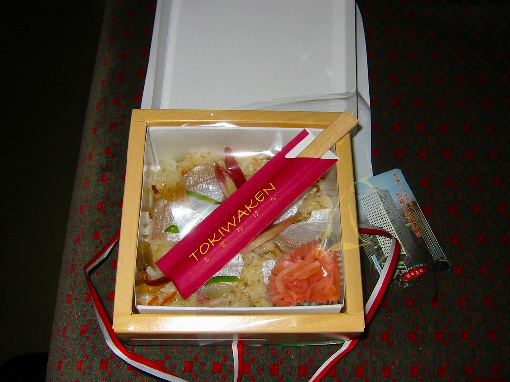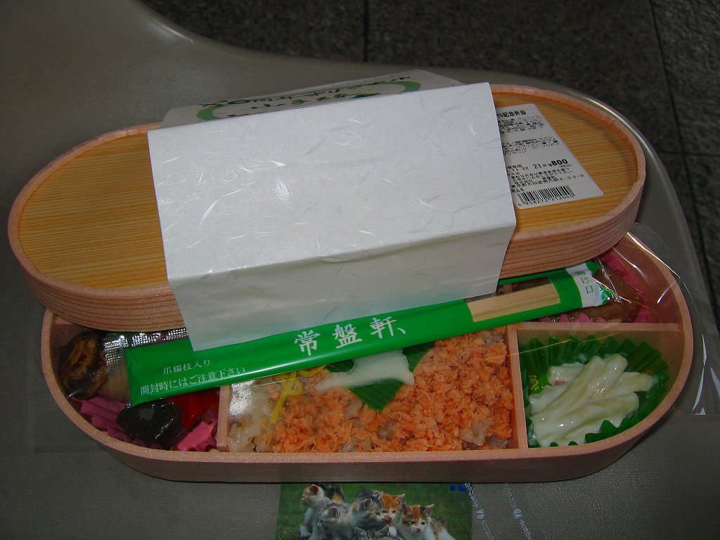 東海道新幹線の品川駅の開業に合わせて、2003(平成15)年10月1日に発売。升のように組み上げた木目印刷のボール紙容器に鯛の掛紙をかけて紅白のひもでしばる。中身はちらし寿司で、混ぜ御飯のような酢飯の上にレンコ鯛とみょうがが載っている。嵩はあるが平面積は少ない容器が写真のように枠が大きく、中身は内容積の半分しか入っていないので、分量はかなり少なめ。味も酸味が前面に出過ぎている感じ。この駅弁はもう販売されていないと思う。