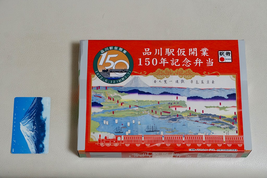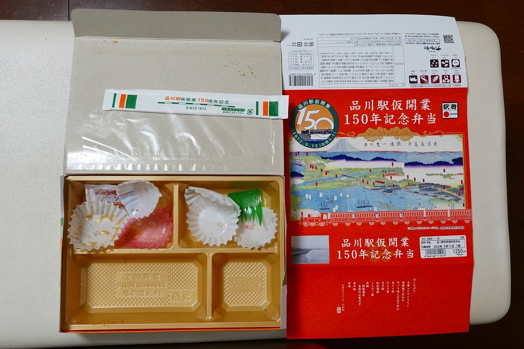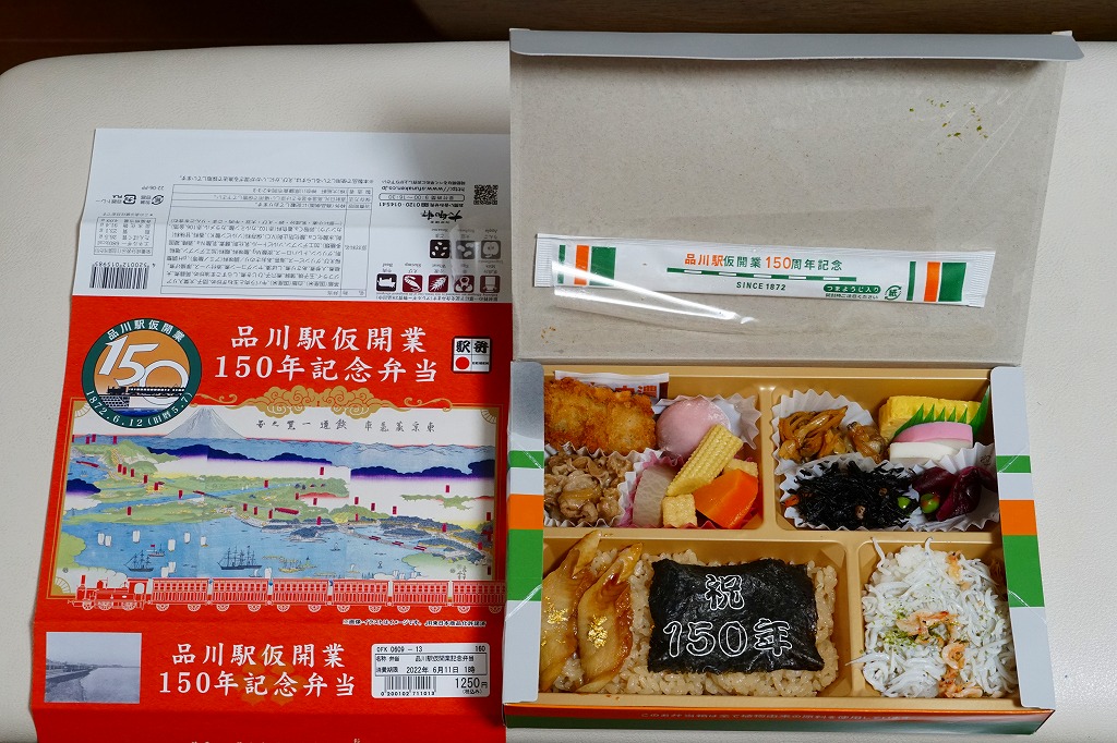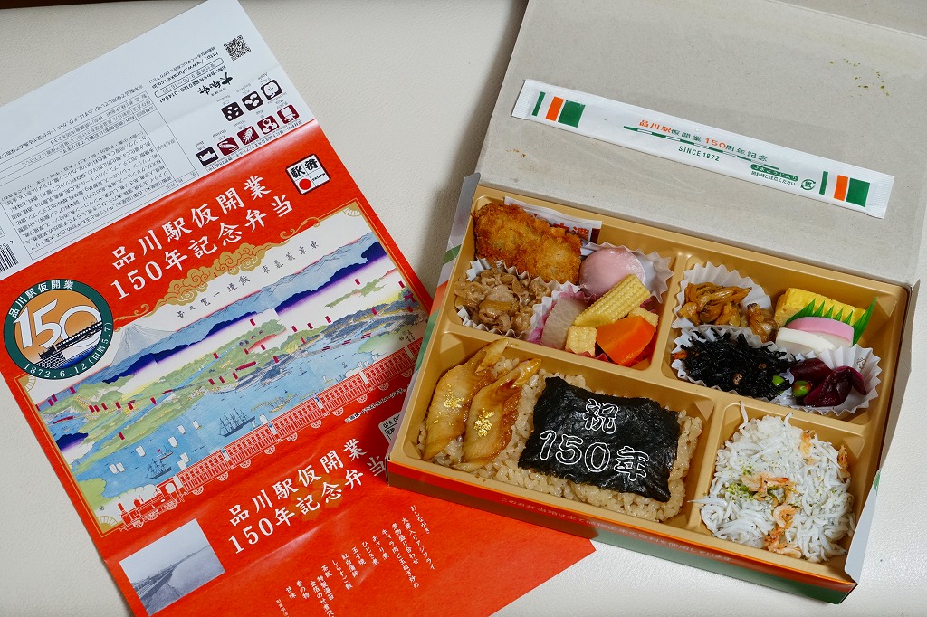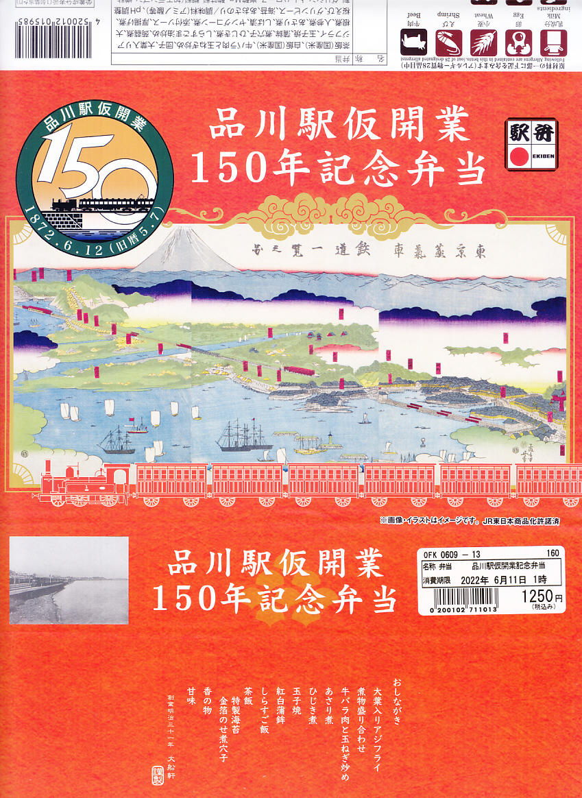 2022(令和4)年6月1日から8月まで、8,000個を販売。駅弁の名前にあるとおり、掛紙に書かれるとおり、1872年6月12日(明治5年5月7日)の品川駅仮開業から150年を記念する弁当。品川駅で駅弁売店「駅弁屋品川」を担当している可能性のある大船軒が品川駅でこの駅弁を市販し、品川駅にも店舗がある横浜駅弁の崎陽軒は6月10日から12日まで完全予約制の商品「品川駅仮開業150年記念弁当」(1,300円)を沿線で2,700個販売した。