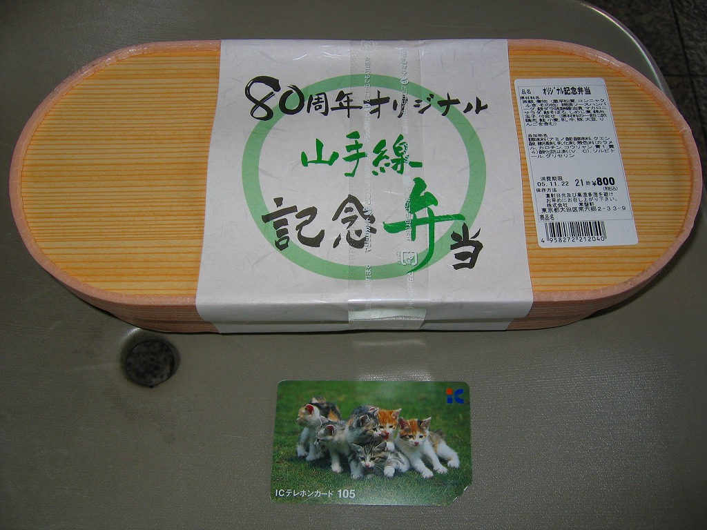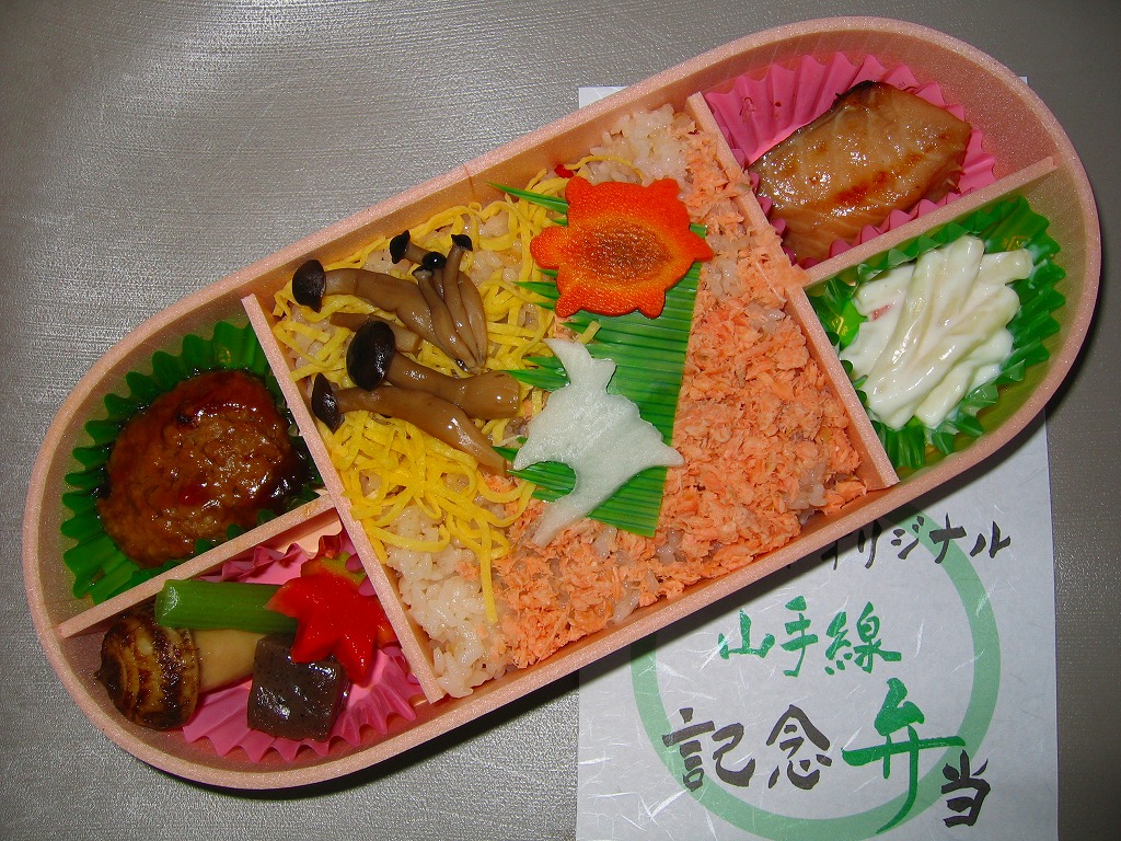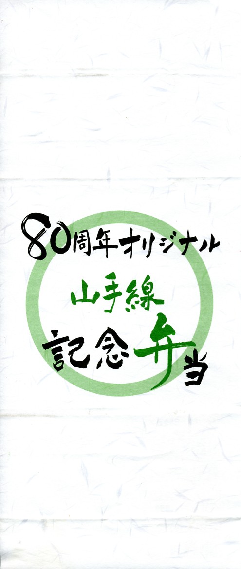 山手線の環状運転80周年を記念して、2005(平成17)年11月に発売。山手線型と言えなくもない長円形のふた付き容器に、簡単な掛紙を巻いて食品表示ラベルを貼ってプラ帯で留める。中身は茶飯の上に鮭そぼろとシメジなどを載せ、ハンバーグや銀ダラ焼やマカロニサラダや里芋などを添える。NRE製でない都内の記念駅弁は希少だが、それ以上の感想はない。