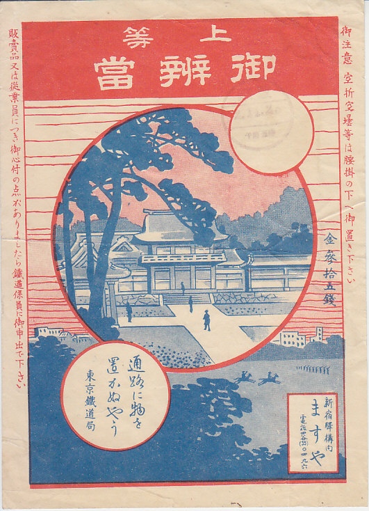 1927(昭和2)年11月20日5時の調製と思われる、昔の新宿駅弁の掛紙。この寺社はどこのものを描いたのだろうか。調製元のますやは後の田中屋のことで、1930年代まで「萬壽屋」の屋号を使っていた。