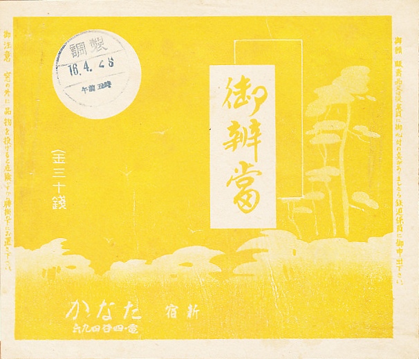 1941(昭和16)年4月28日5時の調製と思われる、昔の新宿駅弁の掛紙。おかずの掛紙は、おそらく特に何かを描いているわけではないと思われる。御飯の掛紙は鉄道省の東京鉄道局管内の各社で共通のもので、駅弁の掛紙では第二次大戦中に呼び掛けられた、汽車や電車の客に向けたマナー啓発。