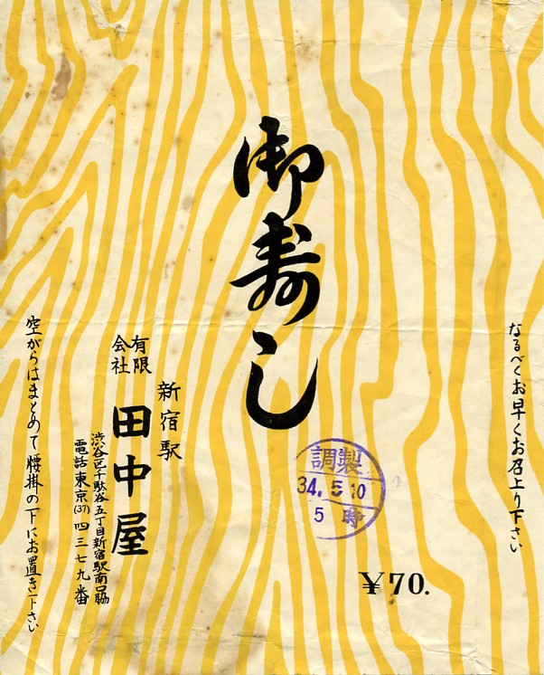 1959(昭和34)年5月10日5時の調製と思われる、昔の新宿駅弁の掛紙。絵柄は年輪に見えるような。新宿駅のすぐ南に渋谷区と新宿区との区界があるので、調製元の所在地も新宿駅南口脇なのに渋谷区千駄谷とある。