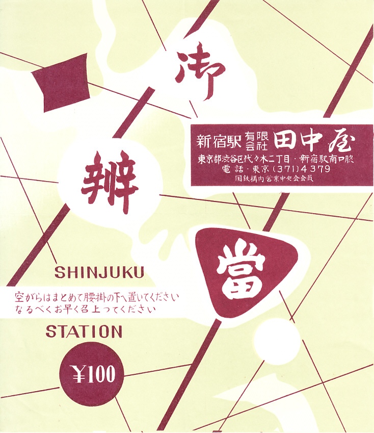 1960年代のものと思われる、昔の新宿駅弁の掛紙。まるで現代アートのような模様で、駅弁の名前や価格に駅名や調製元を描いた。