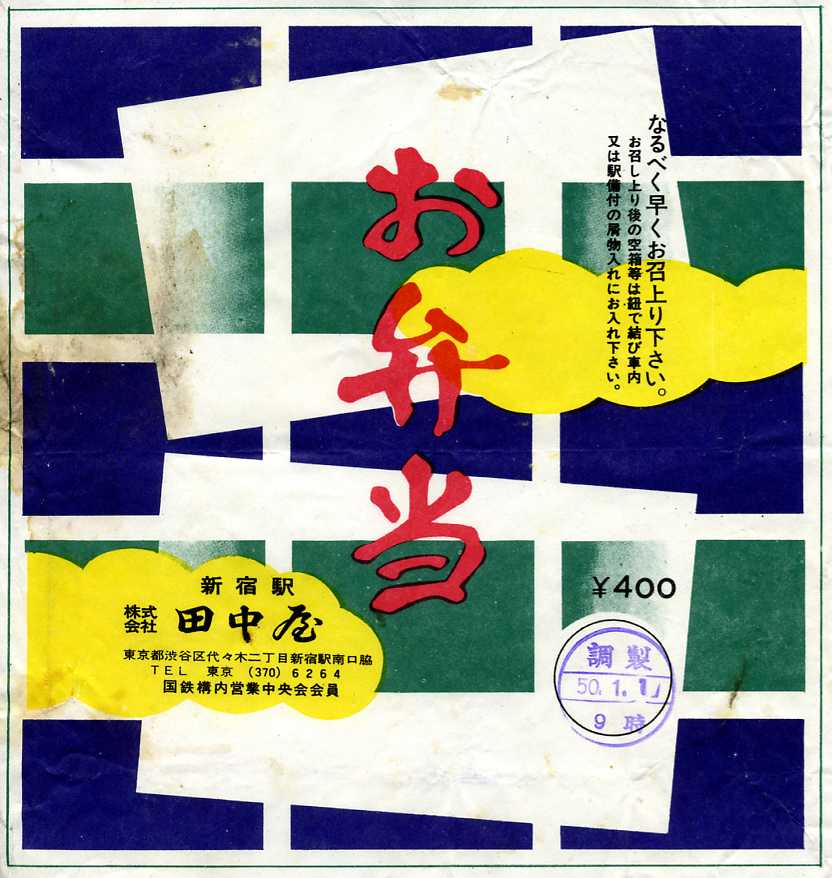 1975(昭和50)年1月1日9時の調製と思われる、昔の新宿駅弁の掛紙。掛紙そのものにさしたる特徴はない。駅弁屋は基本的に年中無休であるが、元日は旅行者が少ないことと、おそらく目出度い掛紙として保存あるいは死蔵されるだろうから、調製印がこの日の駅弁掛紙を入手できたのは珍しいと思う。