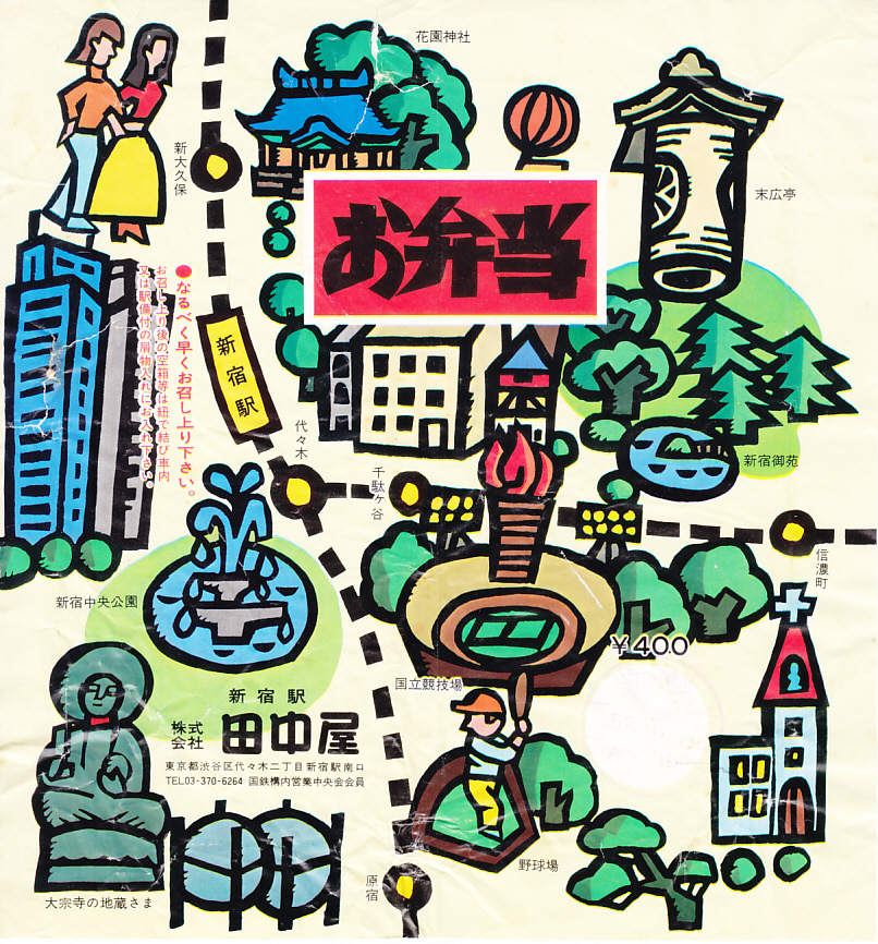 1977(昭和52)年7月25日の調製と思われる、昔の新宿駅弁の掛紙。駅周辺の名所のイラストマップが、東京都新宿という大都会で制作された。40年以上後に見ても、ガスタンクが撤去されて国立競技場を建て替えたくらいで、あまり変化がないことに驚く。