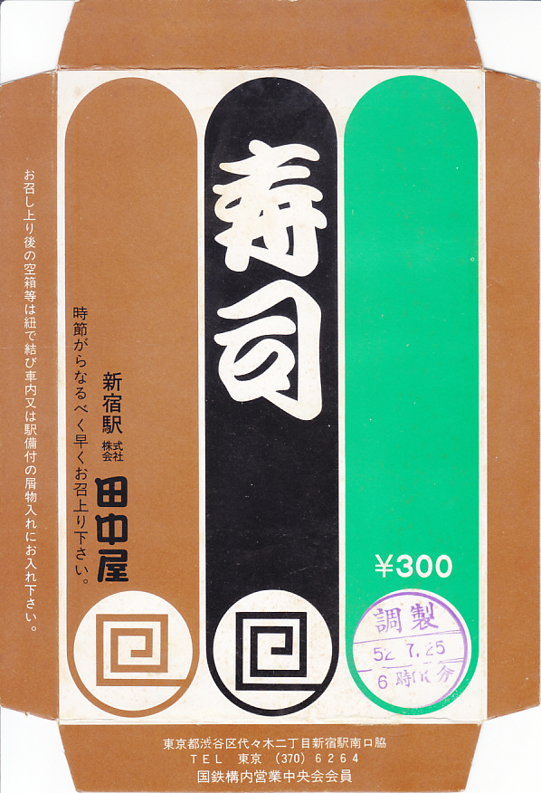 1977(昭和52)年7月25日6時の調製と思われる、昔の新宿駅弁の掛紙。機能的な助六寿司だったのだろう、東京や新宿を思わせたり、旅情や郷愁を誘う絵柄はなにもない。