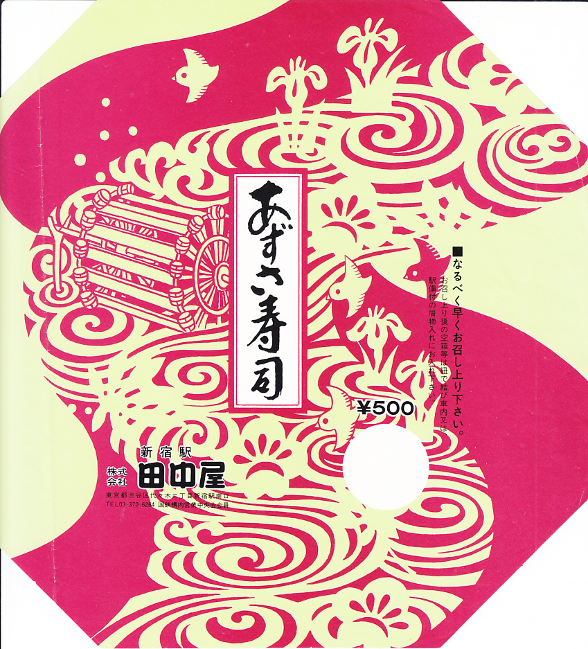 1980年代に使われたのではないかと思われる、昔の新宿駅弁の掛紙。1977(昭和52)年に発売した、いなり、太巻き、細巻き、ちらしのセット。当時はよく売れたという。