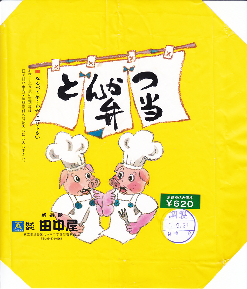 1989(平成元)年9月21日の調製と思われる、昔の新宿駅弁の掛紙。食材となってしまうブタを、調理者や消費者の姿で描くことは、昭和時代の食堂や弁当で定番だと思う。