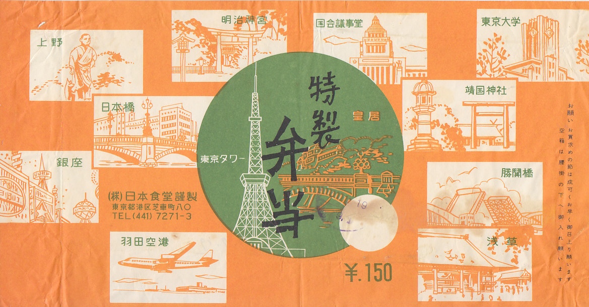 1960年代の調製と思われる、昔の東京駅弁の掛紙。上野、日本橋、銀座、羽田空港、明治神宮、国会議事堂、靖国神社、勝鬨橋、浅草、東京大学、東京タワー、皇居を描いた、駅弁掛紙での東京名所めぐり。