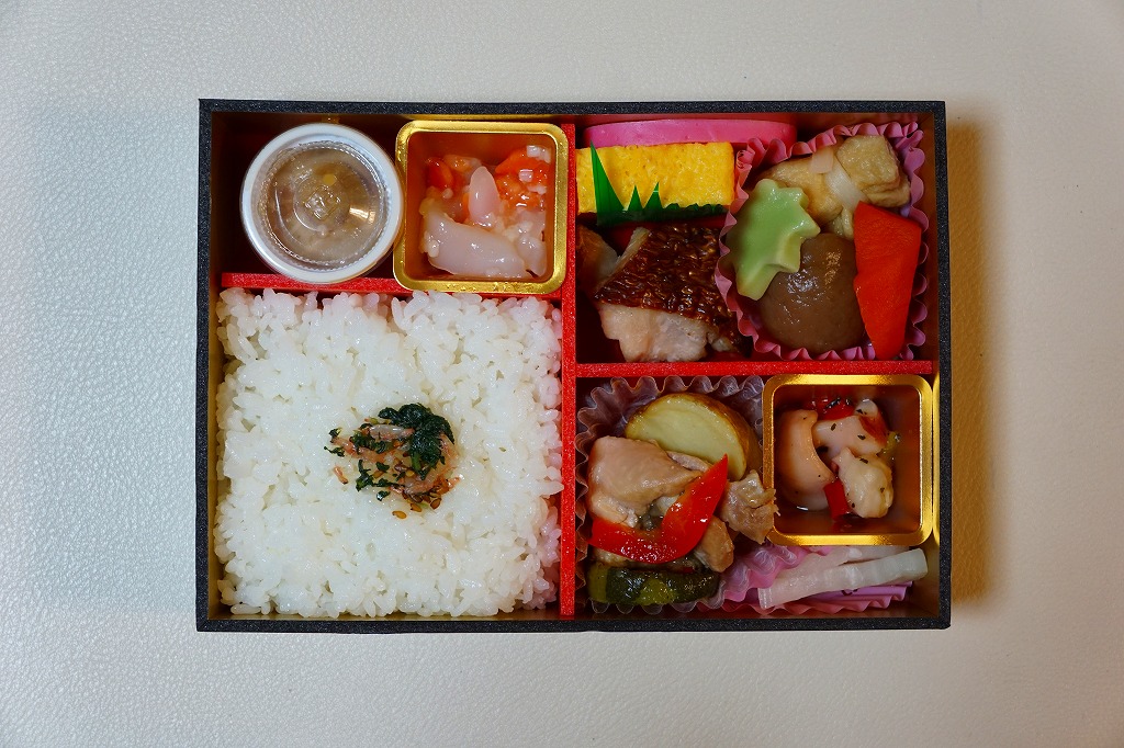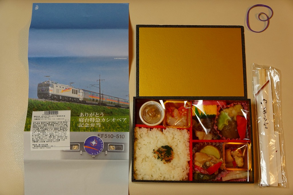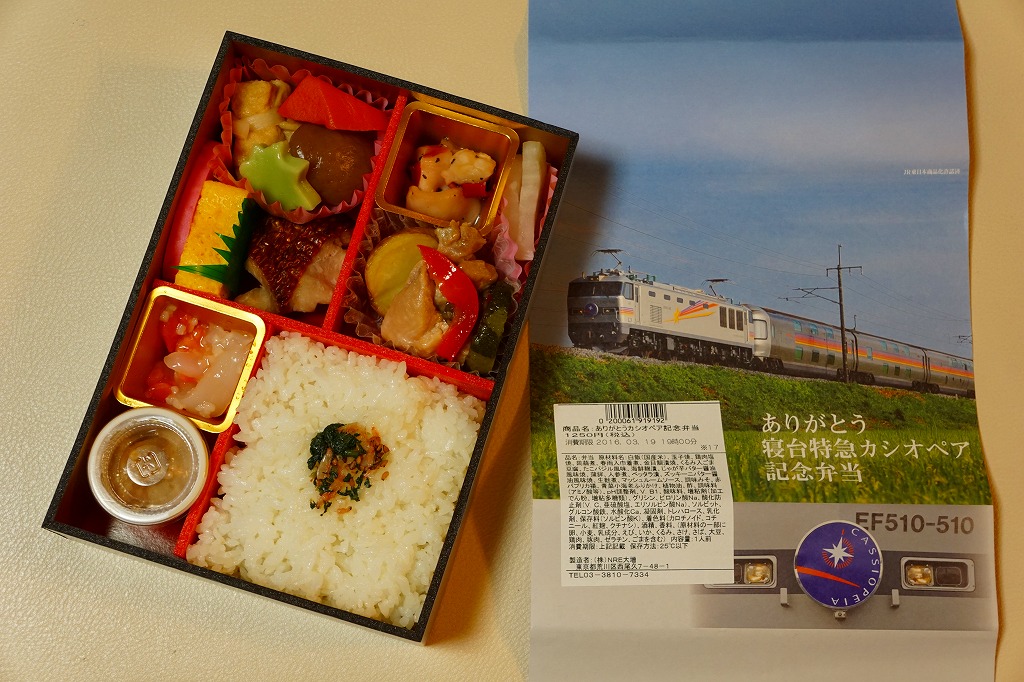 機関車や客車と同じ銀色の容器に、列車内の予約制弁当「カシオペアスペシャル弁当」や食堂車の予約制ディナー「カシオペア懐石御膳」の内容を盛り込んだという中身は、青菜小海老を盛る白御飯、キンメダイ塩焼、かまぼこ、玉子焼、コンニャクやニンジンなどの煮物、鶏肉煮、じゃがいもやズッキーニなどのバター焼、イカと鮭の麹漬、たこバジル、べったら漬など。過去の寝台特急廃止記念弁当と同じ価格なのに、16年間売られたベースとなるメニューがあるからか、完成度の高さと、見た目と味の良さが印象に残った。