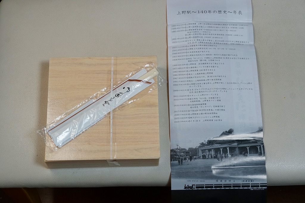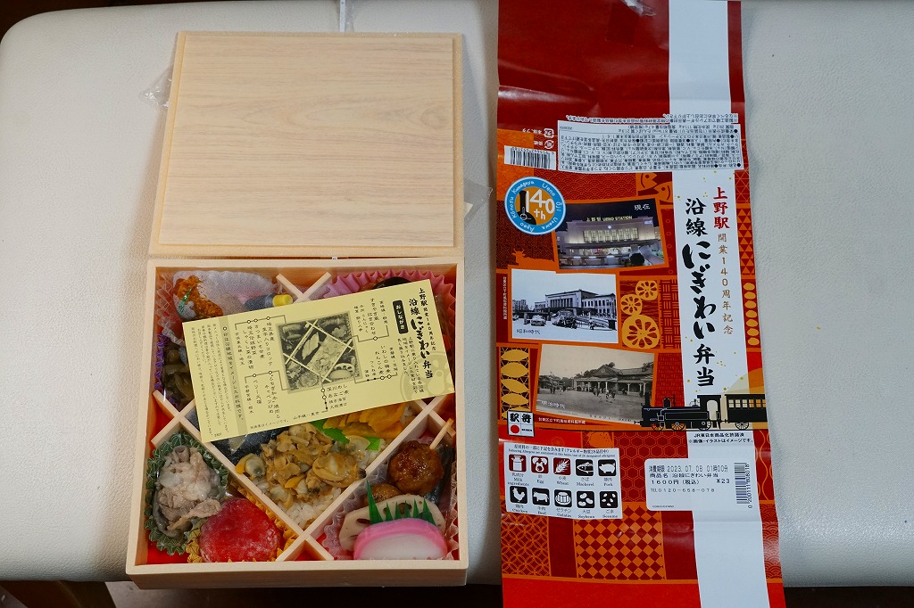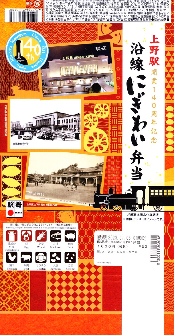 2023(令和5)年7月1日に上野駅と東京駅で発売。上野駅開業140周年を記念し、上野駅に乗り入れている山手線、京浜東北線、高崎線、宇都宮線、常磐線の沿線地域をイメージした食材を彩りよく盛り込んだ弁当なのだという。掛紙では明治時代と昭和時代と現在の上野駅舎の写真を使い、裏面に上野駅の年表を記す。