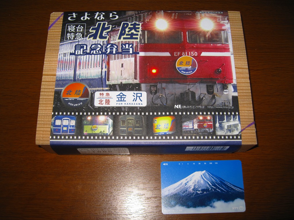 上野と金沢を結ぶ寝台特急列車「北陸」の廃止を記念して、2010(平成22)年3月1日から13日まで販売された記念駅弁。木目柄で長方形の容器を輪ゴムで留め、寝台特急列車の写真をいくつも並べた掛紙を巻き、セロハンテープで留める。掛紙のデザインは3月1日から4日まで、5日から8日まで、9日から13日までの各日で異なるデザインとしたそうな。