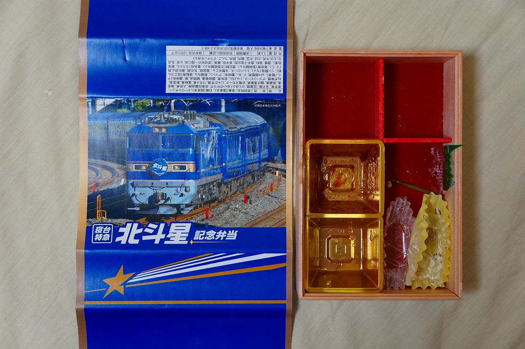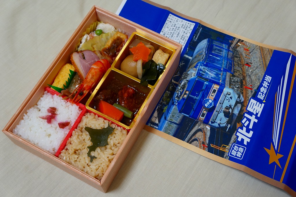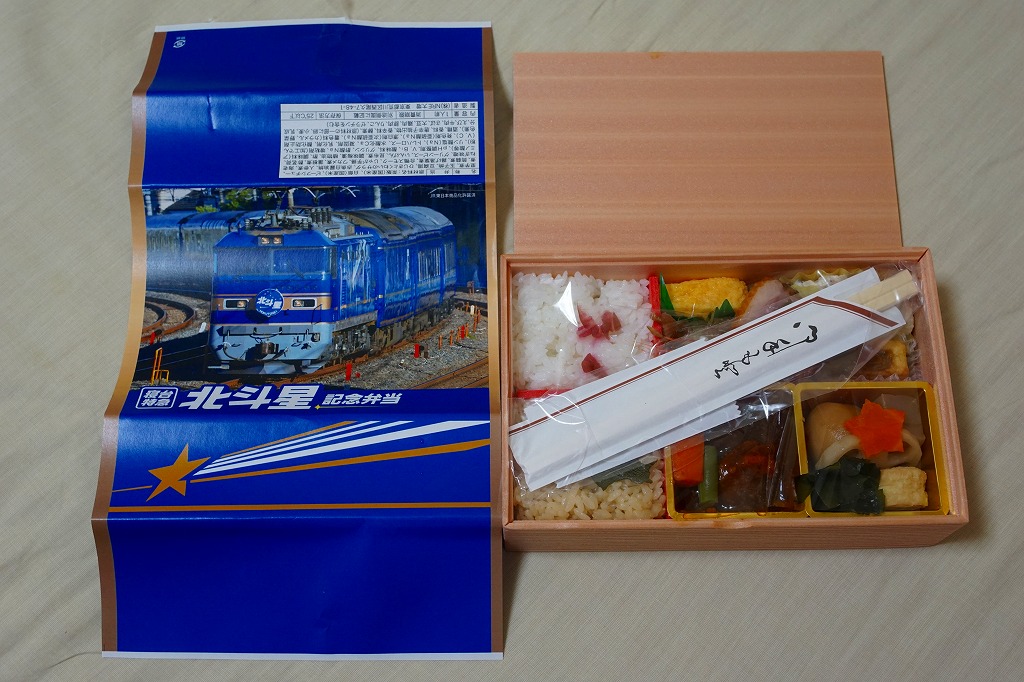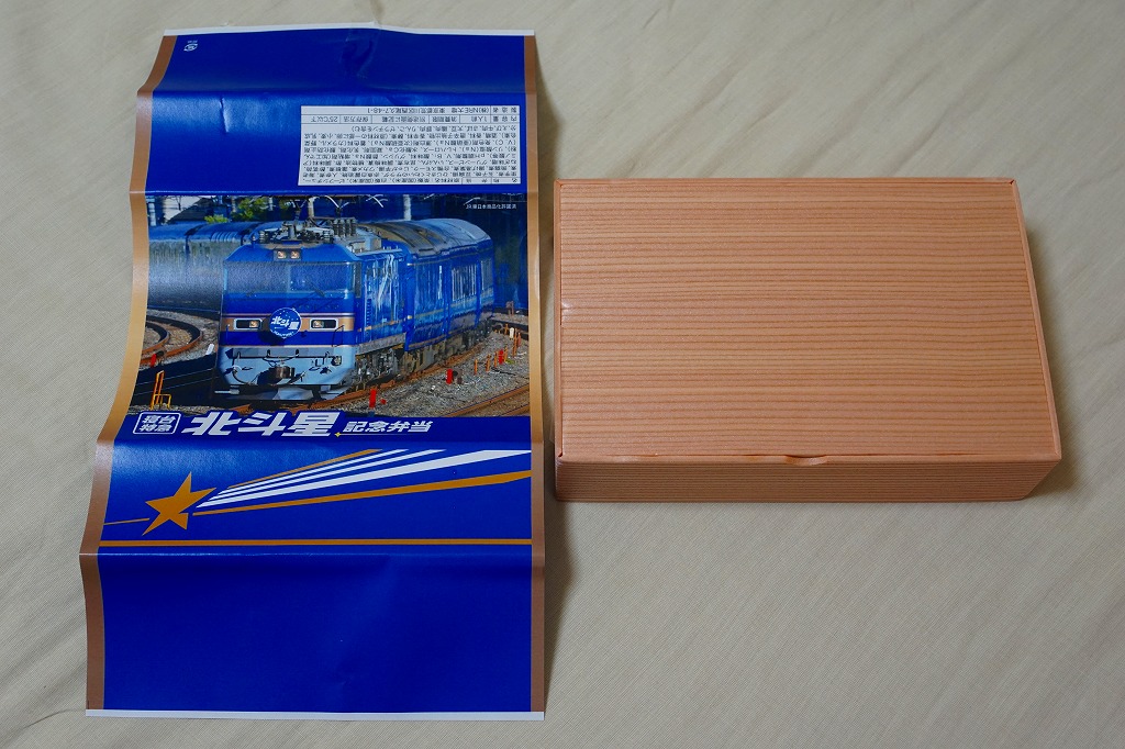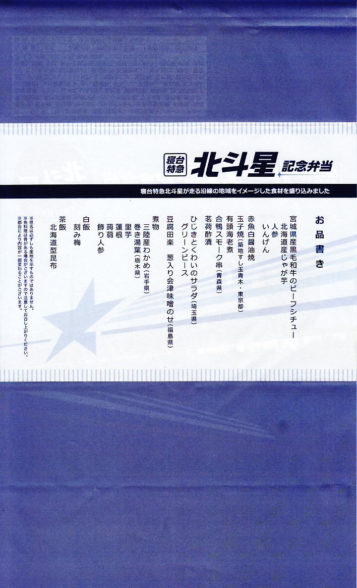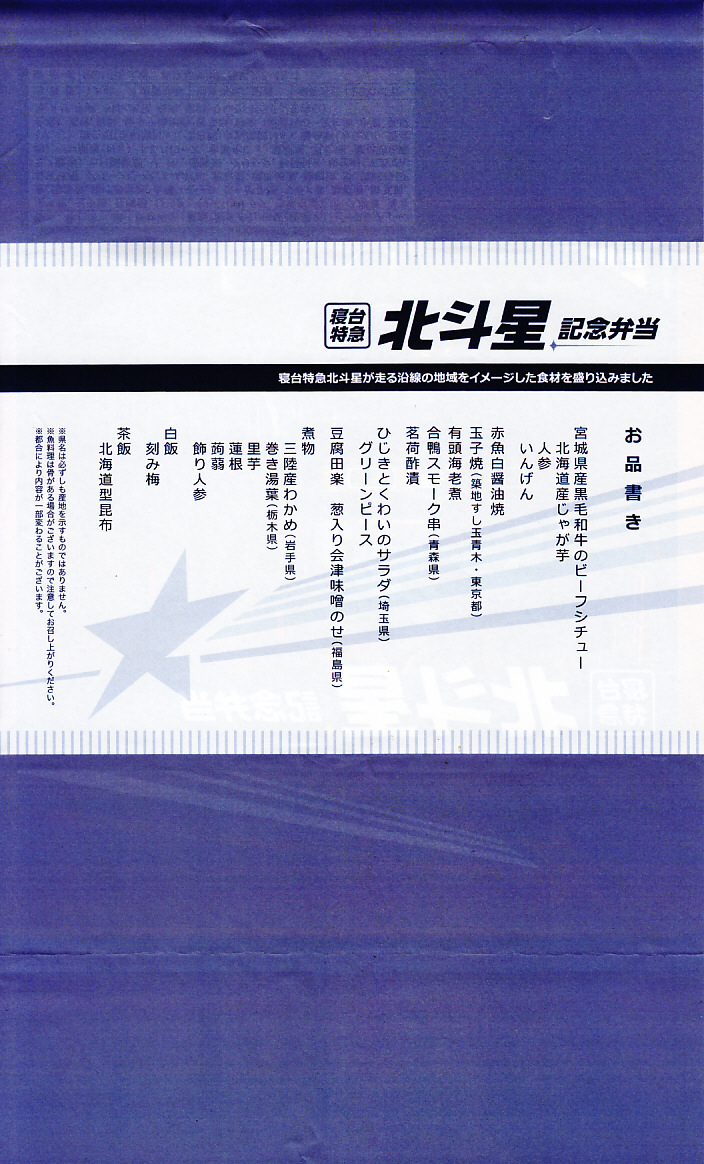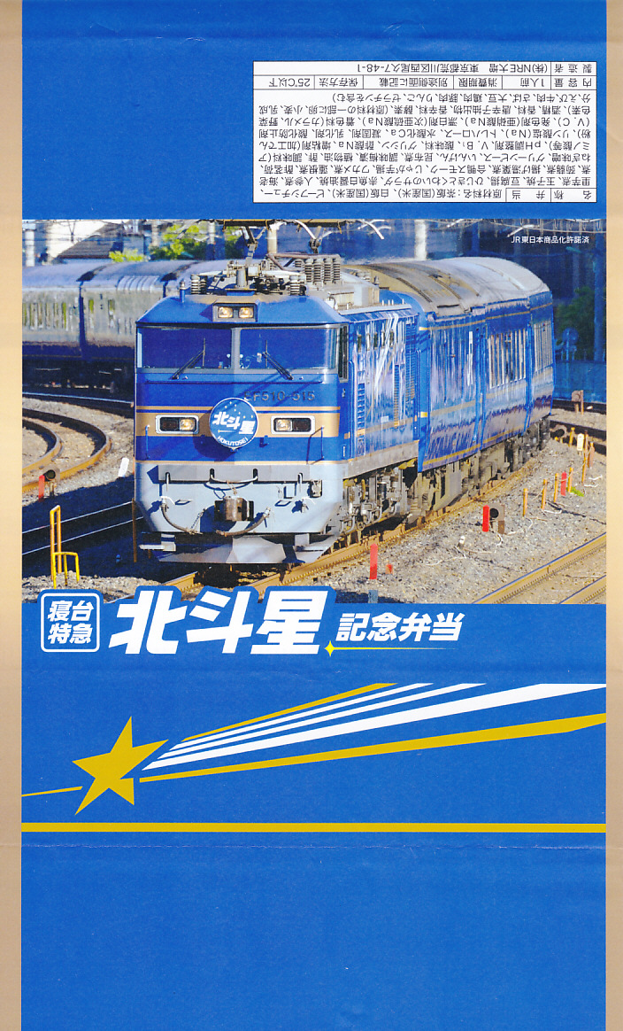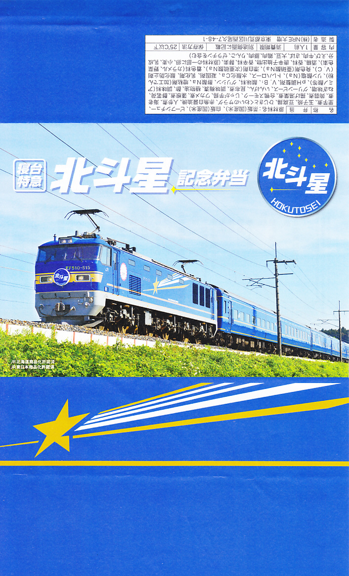 上野駅と札幌駅を結ぶ寝台特急列車「北斗星」の運転終了を記念して、2015(平成27)年8月1日から13日までと、17日から23日まで、上野駅の駅弁売店「駅弁屋 匠」と59号売店で販売。掛紙の写真はもちろん、寝台特急北斗星号。8月1日から10日までと11日から23日までで、掛紙を変えて販売。