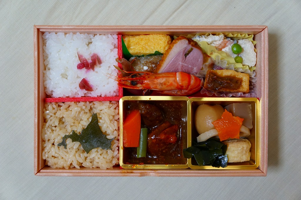 北斗星が走る沿線の地域をイメージした食材を入れたという中身は、掛紙の裏面に書かれるとおり、茶飯と白飯、ビーフシチュー、湯葉やワカメなどの煮物、有頭海老、合鴨スモーク、赤魚焼、ひじきとくわいのサラダ、玉子焼など。4か月前に食べた「カシオペアスペシャル弁当」との共通点を感じた。