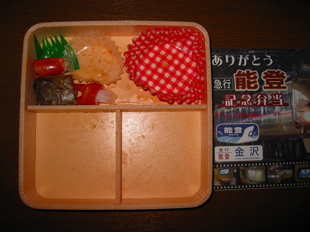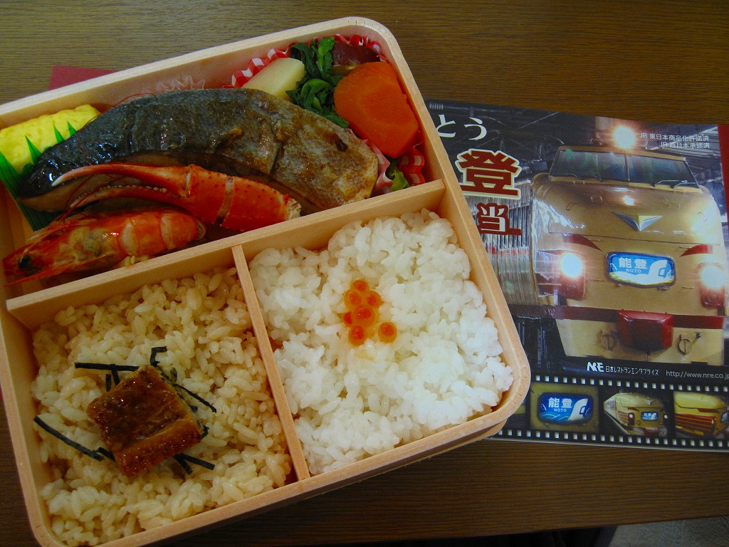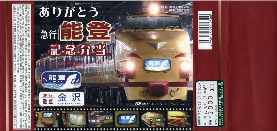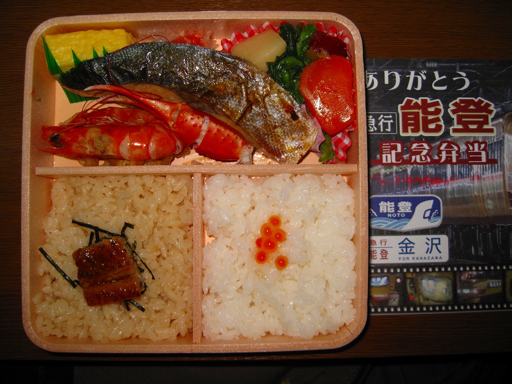 上野と金沢を結ぶ急行列車「能登」の廃止を記念して、2010(平成22)年3月1日から13日まで販売された記念駅弁。正方形の容器に木目柄のボール紙でふたをして、急行列車の写真をいくつも並べた掛紙を巻き、セロハンテープで留める。中身はイクラ付き白御飯とウナギ付き茶飯、ブリ照焼、有頭海老、カニ爪焼き、玉子焼、イカとサケの和え物、ホタテやタケノコなどの煮物など。