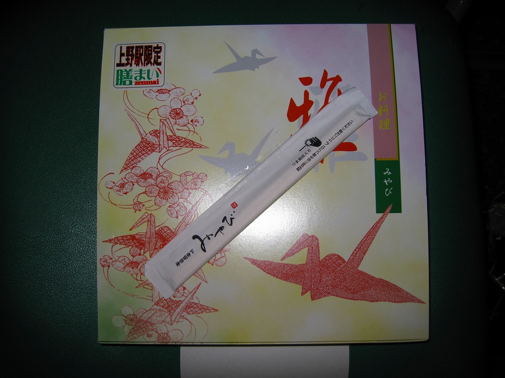2015年8月21日に購入した、上野駅弁の掛紙。上記の予告のとおり、販売期間の後半は違う掛紙、具体的には列車の写真のみが異なる掛紙で販売した。値段と中身は同じ。