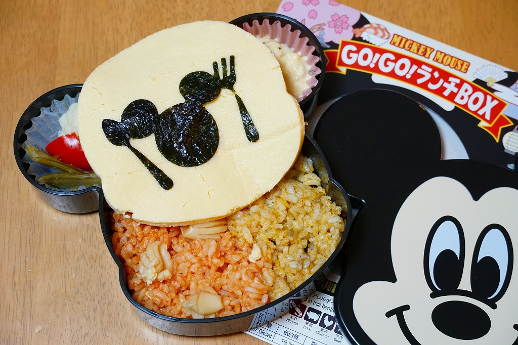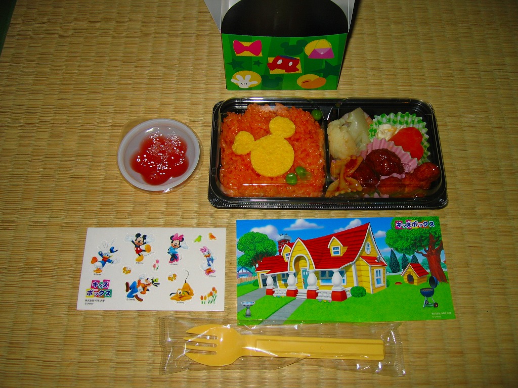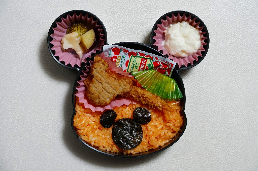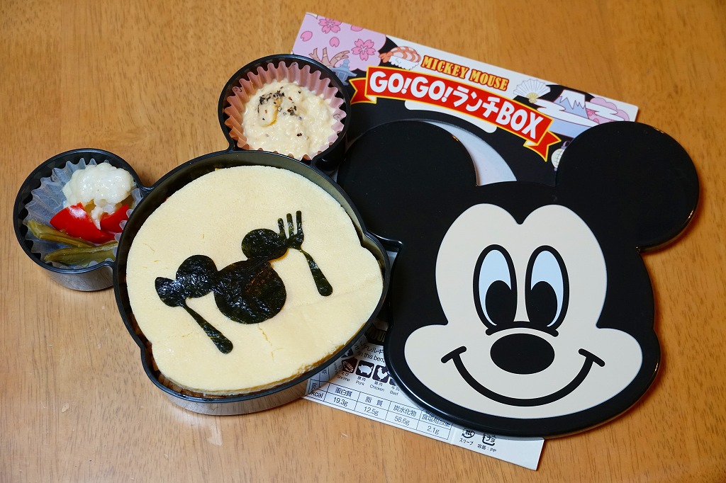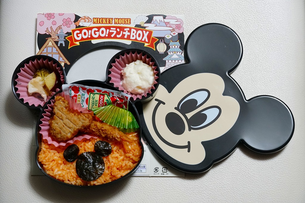 見た目はご覧のとおり。世界中で知られる有名キャラクターを見間違えようがない、ド直球の出現に驚かされる。プラ容器の中身は、チキンライスに海苔を置いて、海老フライとハンバーグとミックスベジタブルとさつまいもレモン煮とケチャップを添え、ピクルスとポテトサラダを張り出すもの。なお、このキャラクターが東京駅弁になることは、下記のとおり初めてではない。