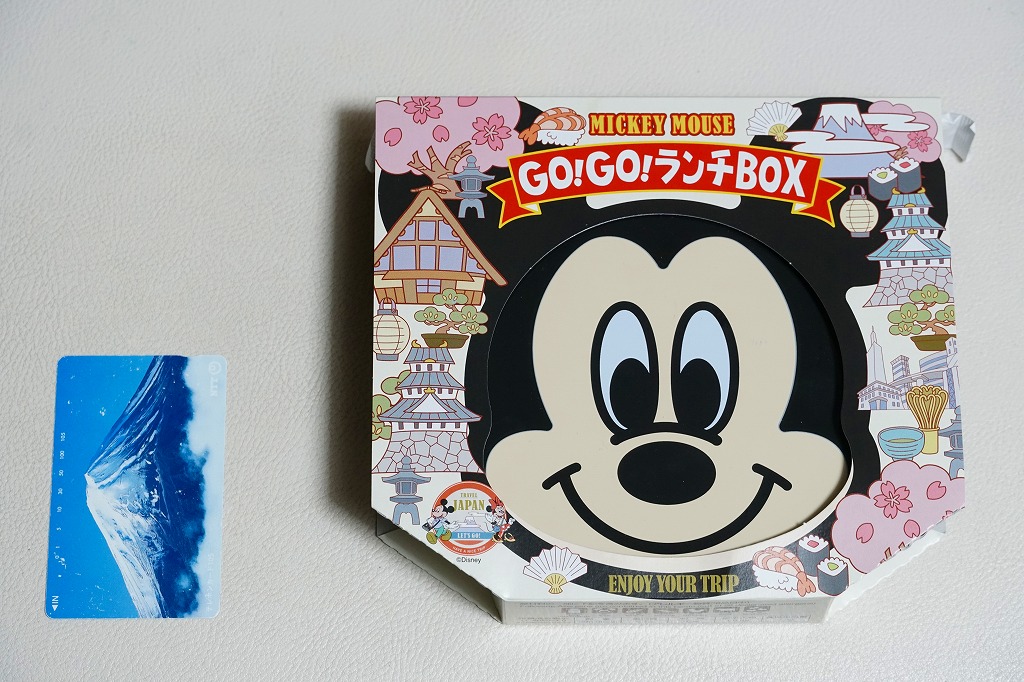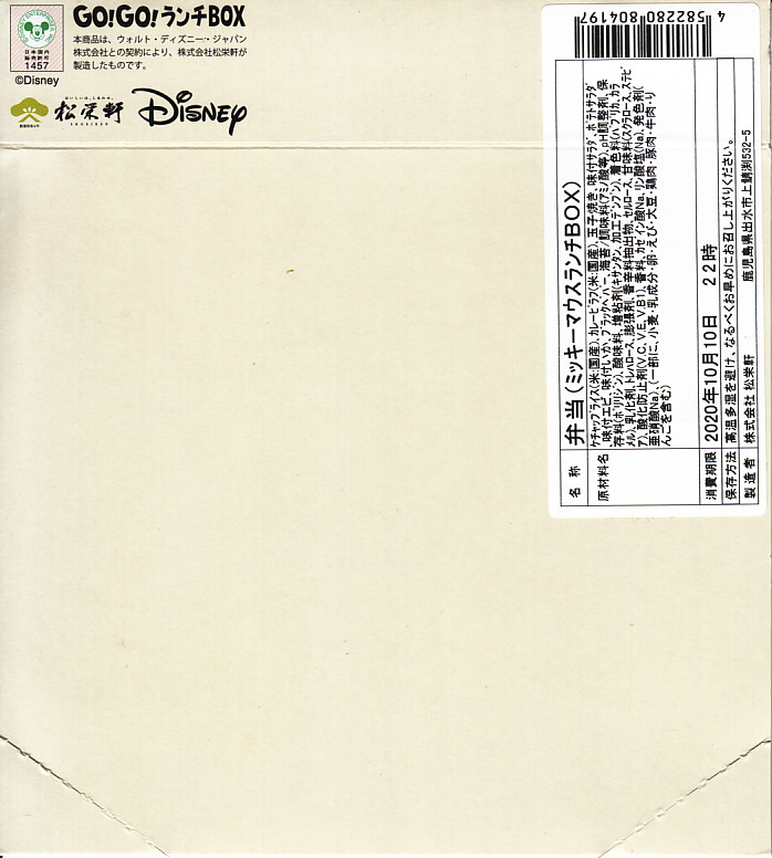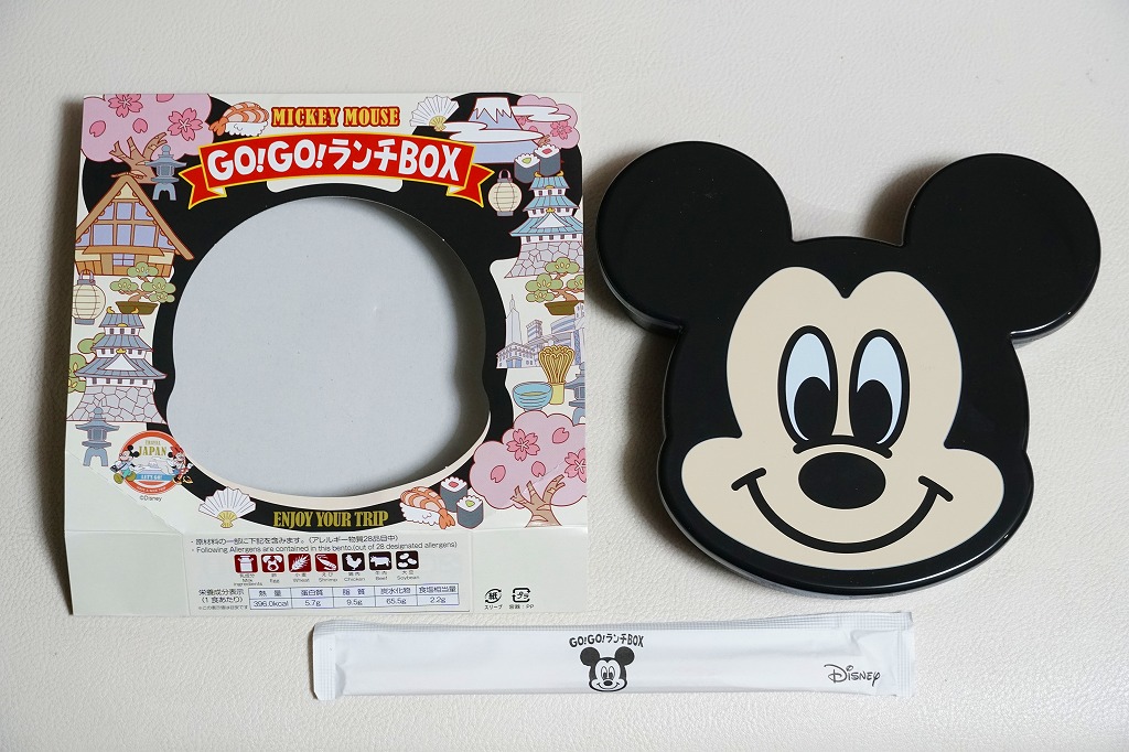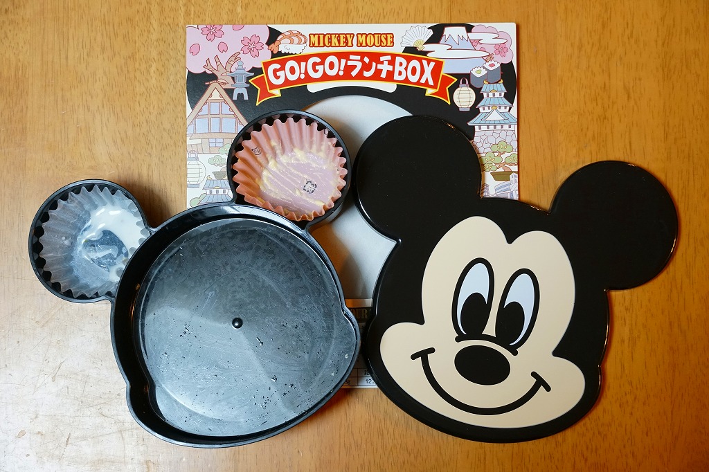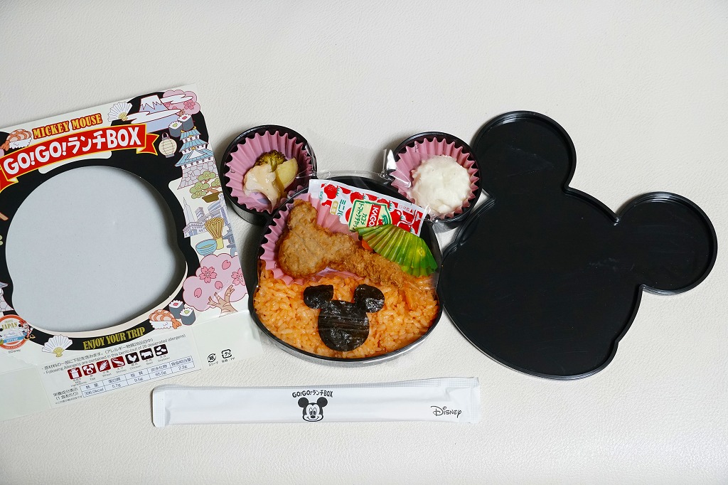 見た目はご覧のとおり。世界中で知られる有名キャラクターを見間違えようがない、ド直球の出現に驚かされる。プラ容器の中身は、チキンライスに海苔を置いて、海老フライとハンバーグとミックスベジタブルとさつまいもレモン煮とケチャップを添え、ピクルスとポテトサラダを張り出すもの。なお、このキャラクターが東京駅弁になることは、下記のとおり初めてではない。