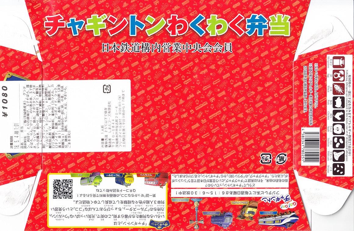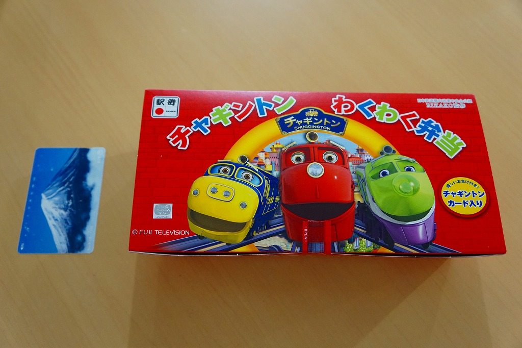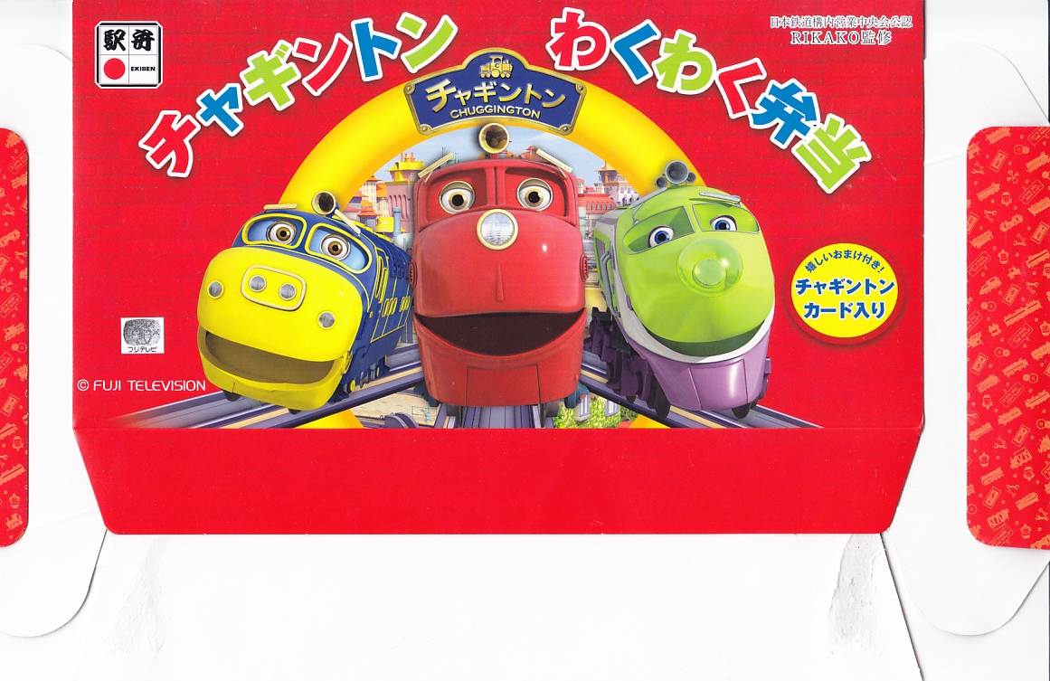 2018(平成30)年4月21日に東京駅と埼玉県大宮の鉄道博物館で発売。日本ではフジテレビが版権を持つイギリスのテレビアニメ「チャギントン」がテーマの駅弁。東京駅の名駅弁「チキン弁当」と同じような構造を持つバスケット型の紙箱には左から、アニメの機関車型キャラクター「ブルースター」「ウィルソン」「ココ」の顔が描かれる。