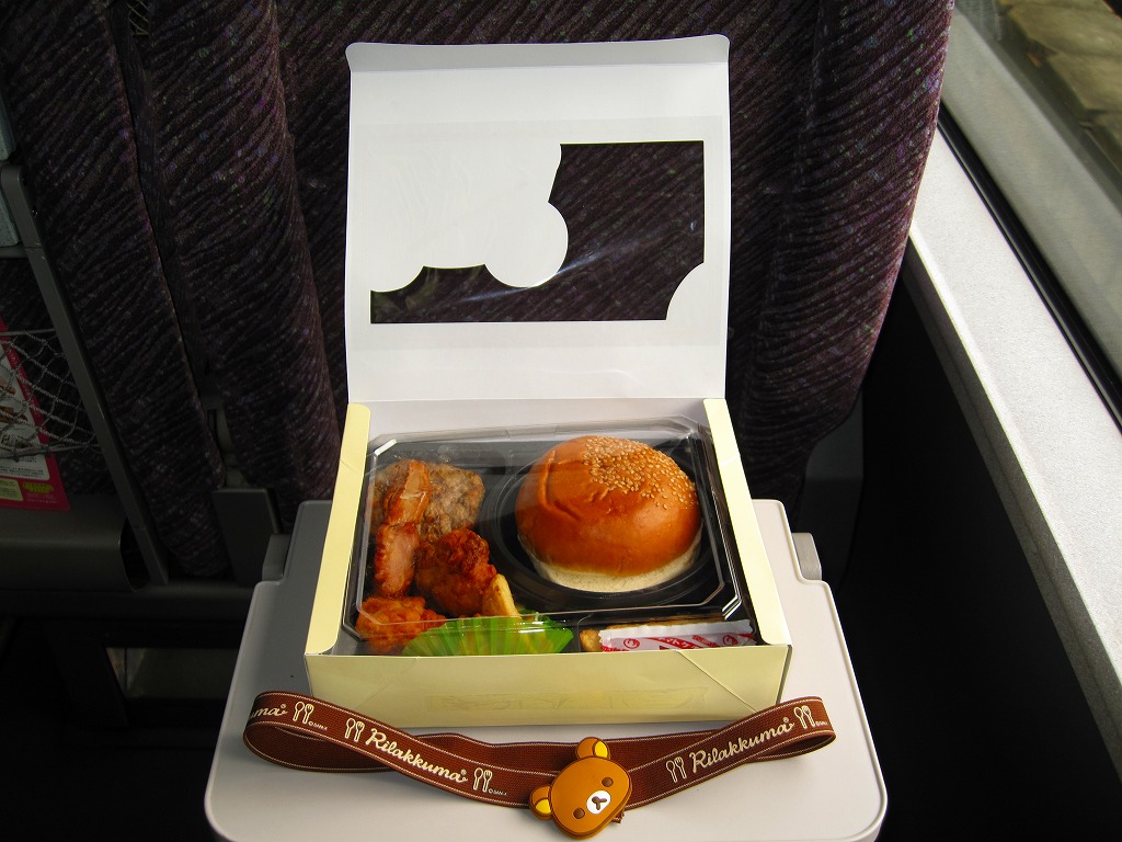 2008(平成20)年11月までに発売したと思われる、駅弁では初めて見たパーツ組み立て式ハンバーガー。販売箇所は東京駅と上野駅の「膳まい」だろうか。2003年に登場したサンエックス株式会社のキャラクター「リラックマ」を大きく描いた、ボール紙製で大きめな正方形の専用容器を使用、これをやはりこのキャラクターの顔で結んだ太いゴムの帯で留める。