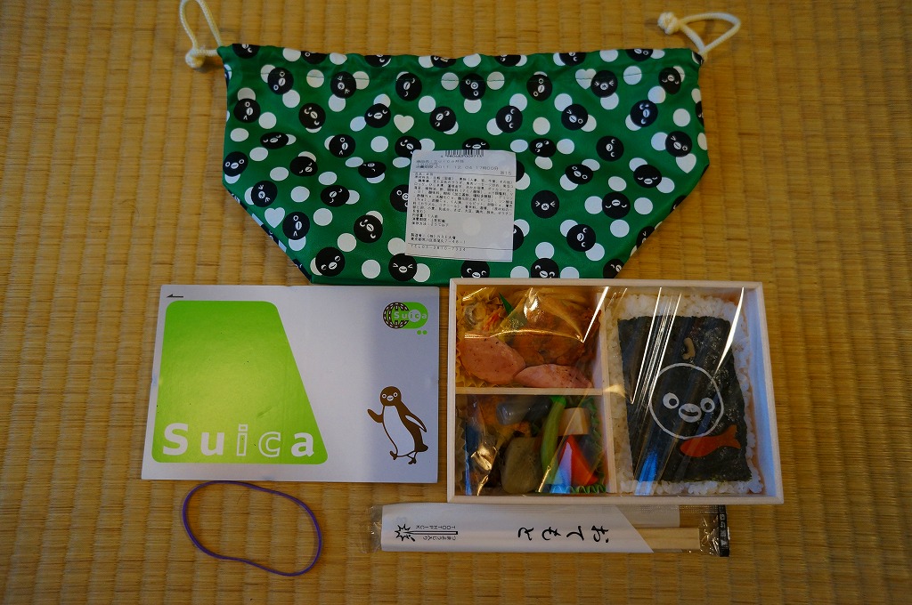 ふたで密封できるプラ製の小さな弁当箱では、JR東日本のICカード乗車券「Suica(スイカ)」のキャラクターであるペンギンが旗で列車に信号を出し、これを緑色のスリーブに収める。中身は御飯の部分にトマト風味ライスおむすび、ライスコロッケ、玉子焼、塩トマト甘納豆。おかずの部分にスパゲティナポリタンとポテトフライ、鶏マスタード焼、ウインナー、海老フライ、チーズポテトサラダ、ハンバーグ。子供向けの容器と洋食弁当の内容に、大人向けの味付けをした感じ。11月中には売り切れか。