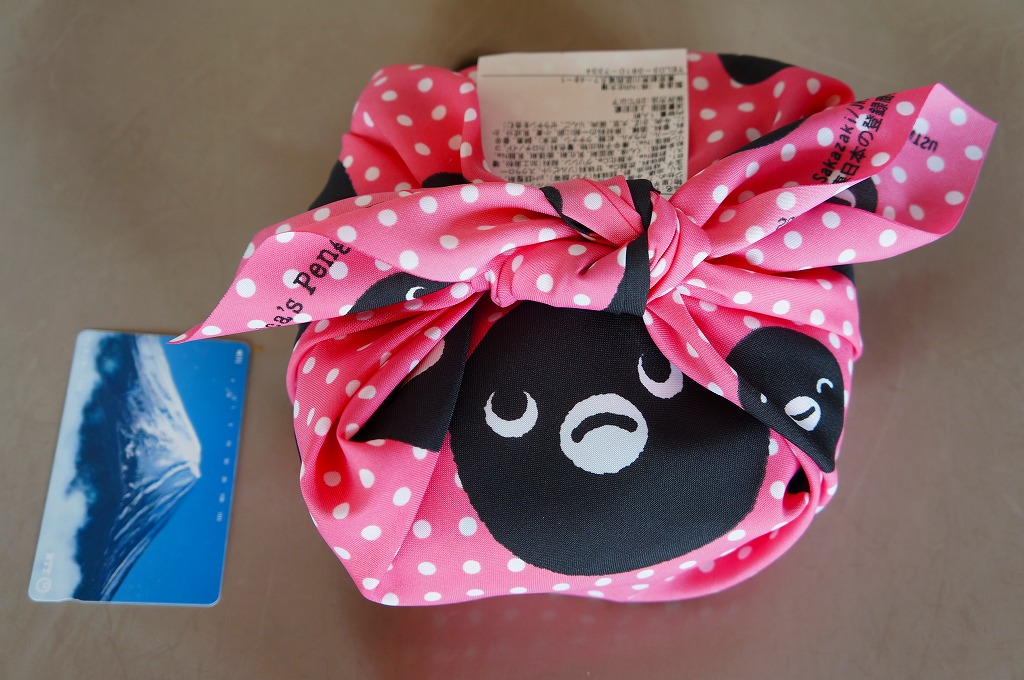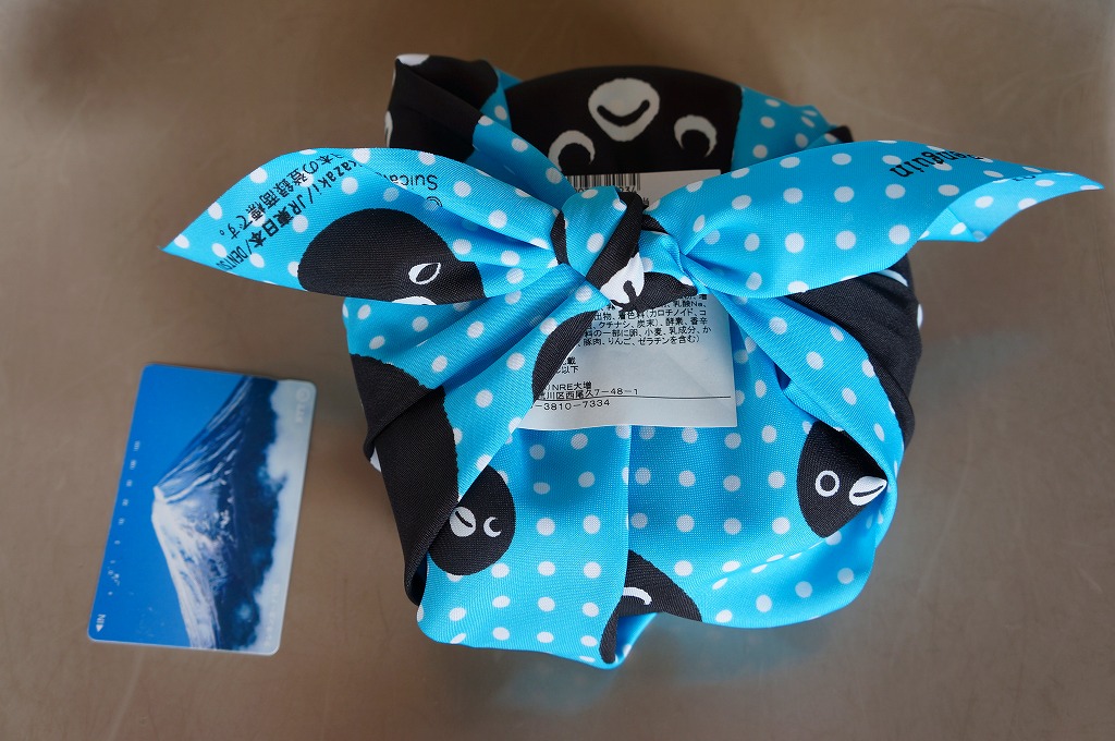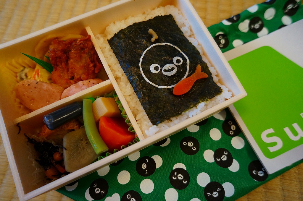 東京駅の駅弁売店「駅弁屋 祭」で2013(平成25)年3月18日から27日まで開催された「交通系ICカード全国相互利用開始記念駅弁大会」で売られた記念弁当。JR東日本のICカード乗車券「Suica」のキャラクターであるペンギンの丸い顔で風呂敷と掛紙と容器を揃えた。