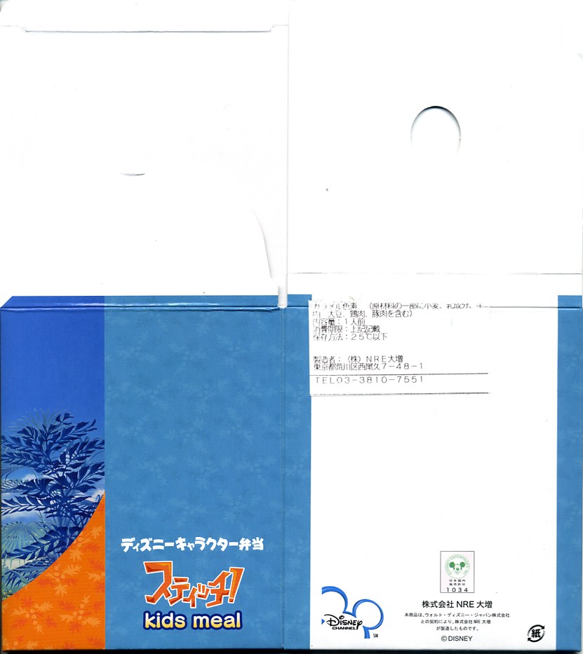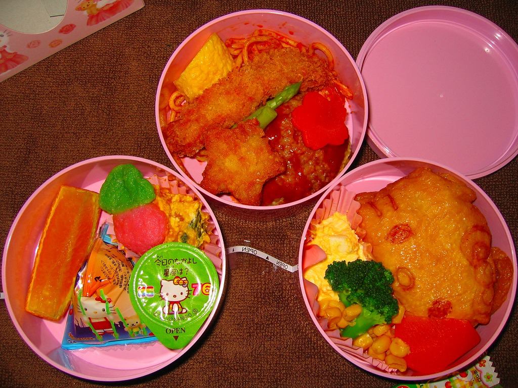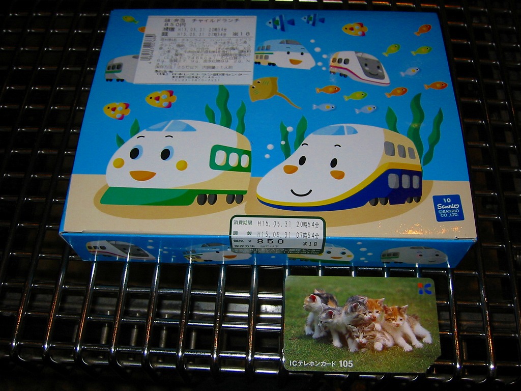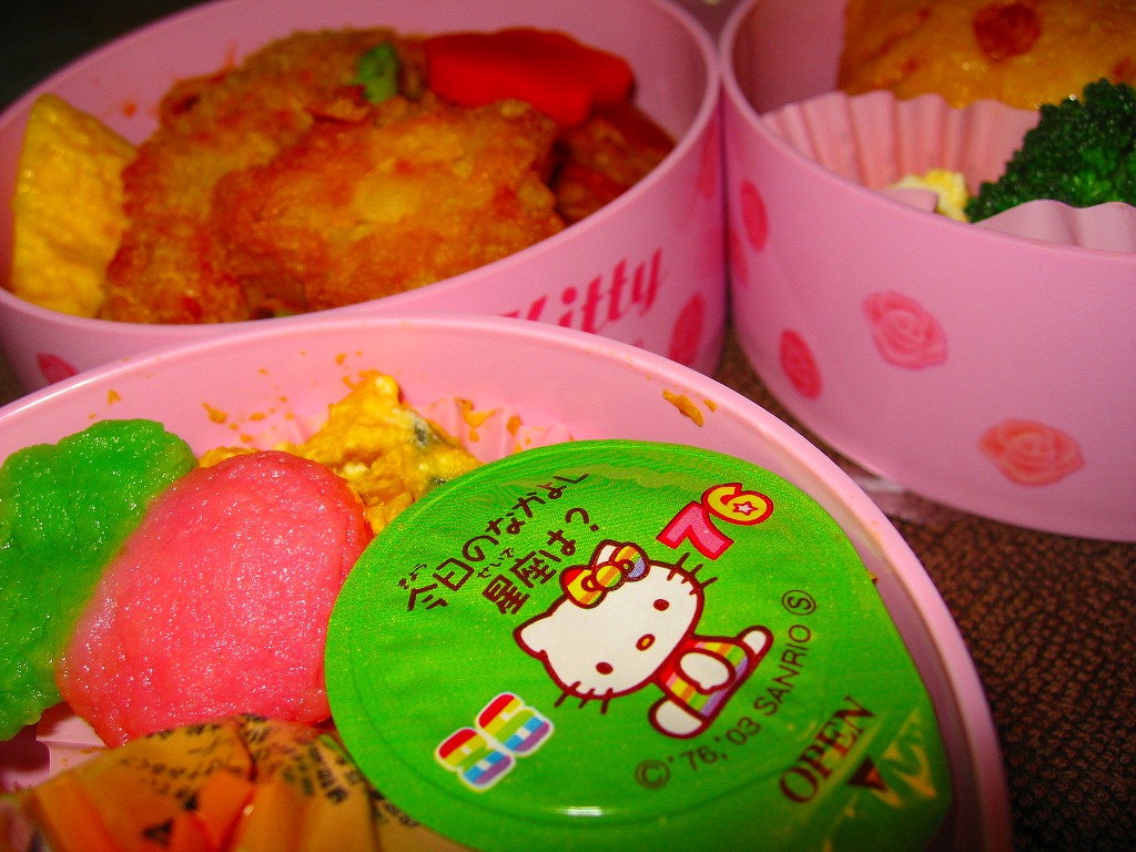 2004(平成16)年7月から12月まで販売された、サンリオのキャラクター「ハローキティ」30周年記念駅弁。キティ柄の円形三段重ねプラ容器を、やはりキティ柄の紙箱に収める。中身は下段がキティ顔のいなりずしに玉子とコーンとブロッコリーとニンジン、中段にエビフライとスパゲティと星形のニンジンやコロッケなど、上段にオレンジと飴とミニゼリーなど。キティ顔のプラ製フォークも付いてくる、中身ではなく容器を買う駅弁。購入時で販売期間は過ぎていたが、なぜか取り扱いがあった。2005年内には終売か。