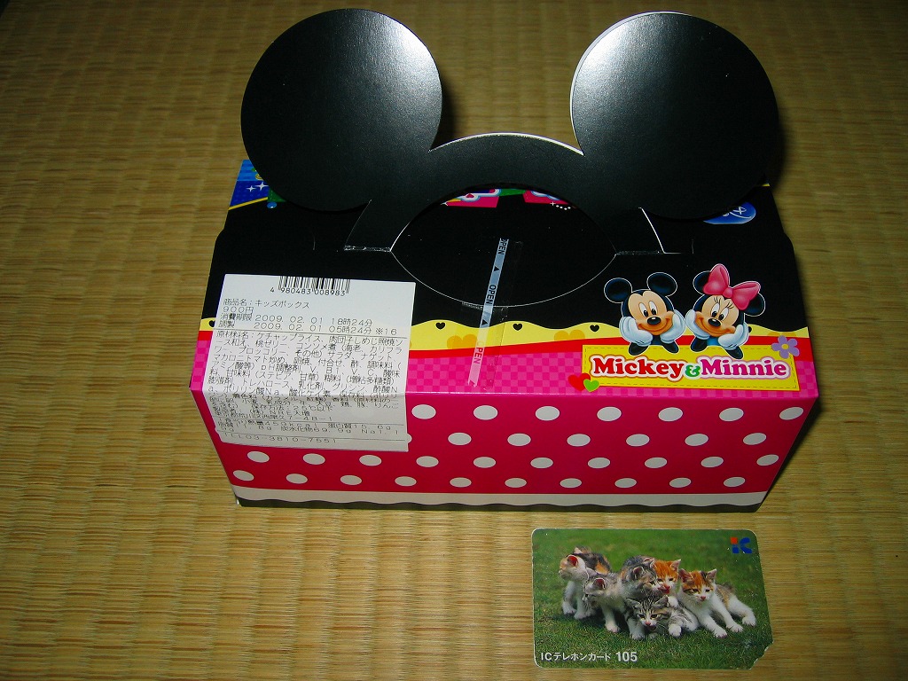 透明なふたが付いた黒いプラ製トレーに収まる中身は、バンズの上下が1組と、ハンバーグ1個、鶏照焼3切れ、鶏唐揚2個、スパゲティとフライドポテト3個、トマトケチャップとマスタード。肉類の分量はけっこうあり、これらを組み合わせてハンバーガーを作ってもよし、すべて挟み込んでスペシャルバーガーをこしらえてもよし、単品で食べてもよし。そんな高カロリーで健康に悪そうな内容がどうであれ、このキャラクターを知らない人はまず買わないであろう、知っている人は買わずにはいられない商品だと思う。ゴムバンドを弁当箱用などに流用してもよし。2009年のうちに終売か。