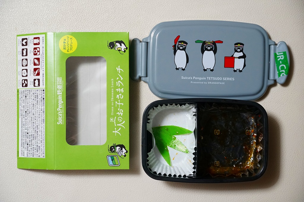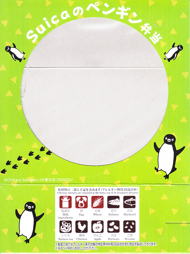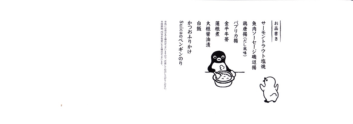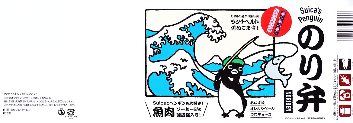 今回は使い捨ての紙容器に、Suicaペンギンが絵柄の表面にも、おしながきの裏面にもいる掛紙を巻く。この紙容器に白飯を詰め、Suicaペンギンの表情を印刷した海苔とかつおふりかけで覆い、サーモントラウト塩焼、魚肉ソーセージ磯辺揚、鶏唐揚、パプリカ揚、きんぴらごぼう、れんこん、だいこんを載せる。東京で売られる海苔弁としては標準的な、千数百円の価格に抑えられたキャラクター弁当。ジャガード織のゴムタイプのランチベルトの青か緑のいずれかを添付するので、他の海苔弁よりお徳か。あくまでも東京駅で買える海苔弁の値段として。