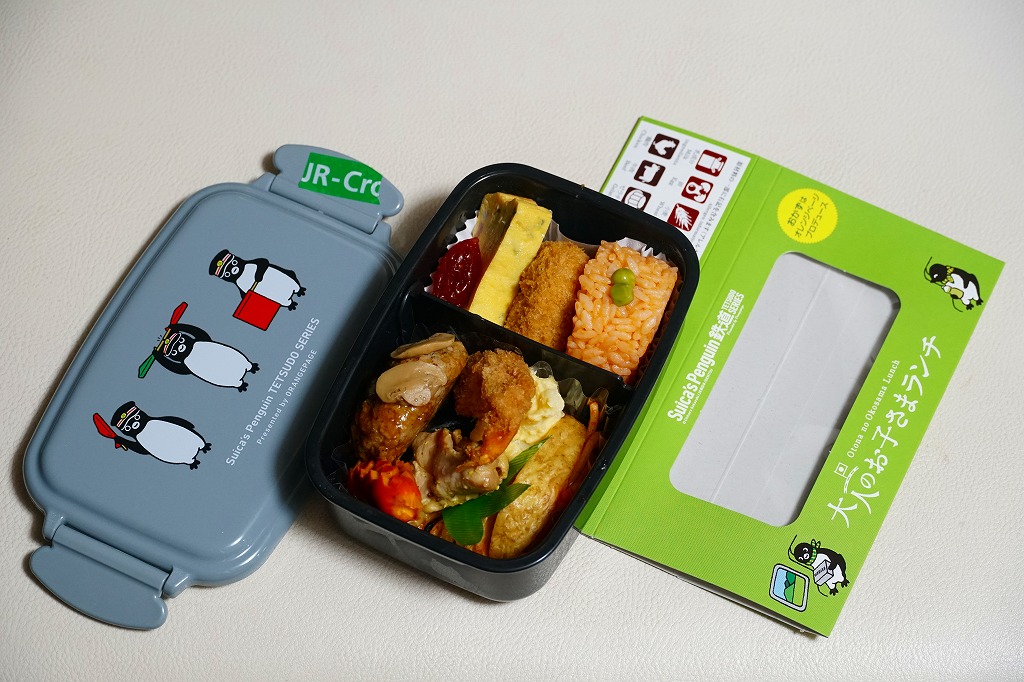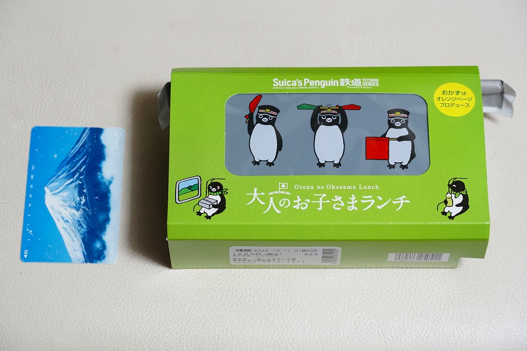商品名は「Suicaのペンギン弁当」とも。2022(令和4)年10月1日から、東京、上野、新宿、大宮の各駅で、20,000個を販売。鉄道開業150年にちなんだ商品群のひとつとして、オレンジページがプロデュース、日本ばし大増が調製し、JR東日本クロスステーションが販売した、JR東日本の100%子会社のタッグ。同月からのJR東日本の駅弁キャンペーン「駅弁味の陣2022」にもエントリーした。
