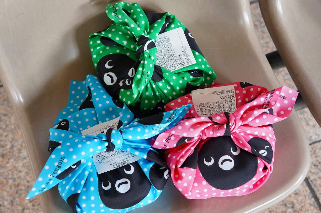 2013(平成25)年3月20日に購入した、東京駅弁の包装。3色とも中身はまったく同じ。風呂敷も単なる色違いではなく、キャラクターの位置や大きさや表情を変えていた。