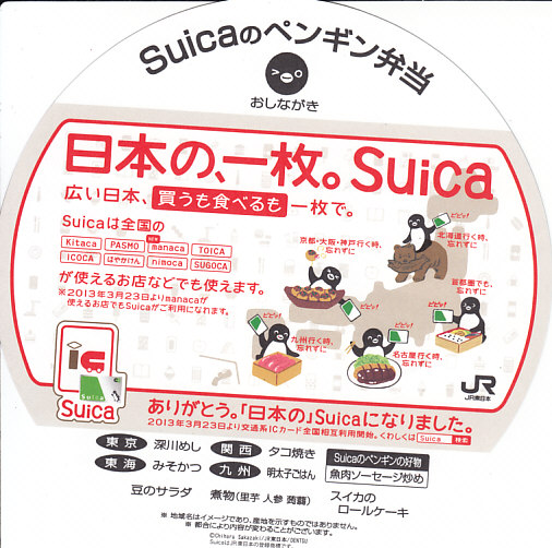 2013(平成25)年3月20日に購入した、東京駅弁の包装。水色、緑色、桃色の3色の展開は広報どおりで、掛紙のペンギンの表情が異なるのはシークレットだった。この年の3月23日に、JR東日本の「Suica」、JR北海道「Kitaca」、関東私鉄の「PASMO」、中京エリアの「manaca」、JR東海の「TOICA」、JR西日本の「ICOCA」、福岡市地下鉄の「はやかけん」、西日本鉄道の「nimoca」、JR九州の「SUGOCA」と関西地区の「PiTaPa」で、ICカード乗車券の相互利用が始まった。PiTaPaを除く9種では電子マネーの相互利用もOK。