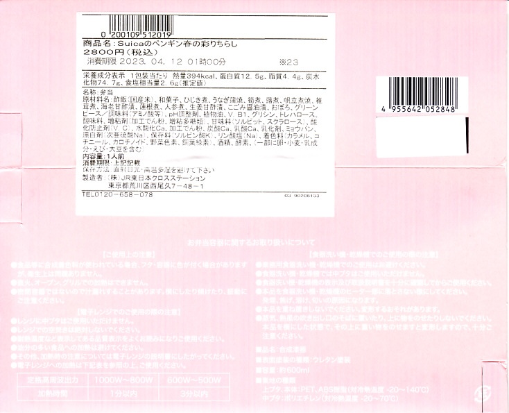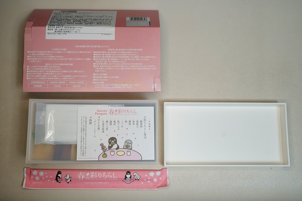 2023(令和5)年3月16日に、東京、上野、新宿、大宮の各駅と鉄道博物館で発売、1万個を販売。2022年10月の「大人のお子さまランチ」に続く、オレンジページプロデュースの駅弁第2弾なのだそうな。第2弾といわず、過去にもいろいろあった気がするけれど。石川県の山中塗の漆器風の弁当箱とする、真っ白で角張った容器には、JR東日本のICカード乗車券「Suica」のキャラクターであるペンギンと、そうでない子ペンギンのような何かが弁当とレジャーシートを広げてピクニック。中身は酢飯をウナギ、ホタテ、エビ、タケノコ、フキなどで覆う「彩りちらし寿司」と、ひじき煮と桜餅。東京の高級折詰もびっくりの高価格も、キャラクター駅弁としてかわいらしいと評判だったようだ。5月までの販売か。